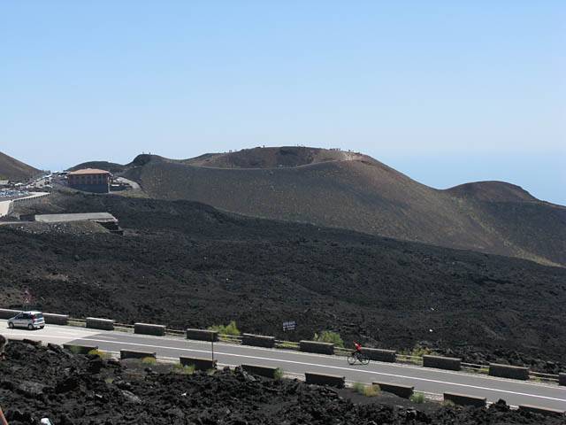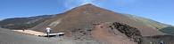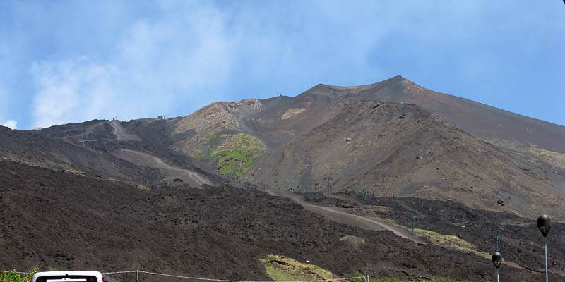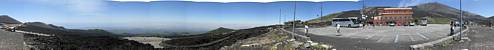 High up the Broom is still in full spring blossom. | A 360 degree panorama taken by the refreshment place. The black lifeless looking fresh lava was laid down just 10 years ago. Many buildings and the road were destroyed in that eruption, then rebuilt since. | Looking across the 10 year old lava to the main Silvestri spent crater. | Looking up towards the summit. We are right under the plume. A ski lift can be seen for the winter months. Apparently you can ski here as late as June. |