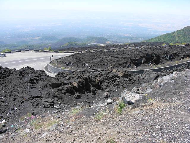 We went to Celebrity Central for 10AM after docking to gather for the Panoramic Sicily trip. We were assigned numbered stickers, and when we went ashore we simply found the bus with the same number on it. A guide held up a lollipop board next to the bus with the same number on it too which also helped. Another sign of how well organised Celebrity are. The bus trip along the autostrada past Taormina was fun. There were lots of tunnels and bridges as the terrain was rather hilly, while the coastline was never far away to the left. Maritzio the guide was very bubbly and chatty and kept us entertained with many local facts and lighthearted jokes. Then we turned off the autostrada and set off along a windy narrow road up into the lower slopes of Etna, which was awesome! First we wound up through various small towns and villages. Then we headed up through the countryside. As we got higher the climate changed rapidly. It was also a nice sheltered microclimate. As a result tropical, desert and temperate plants were all growing together. Bananas, prickly pears, sweet chestnuts, vineyards, etc. Lower down plants had long since finished blossoming while higher up they were still in spring blossom. We also followed a 19th century lava flow up and eventually we cleared the tree line.