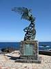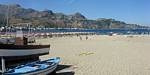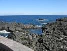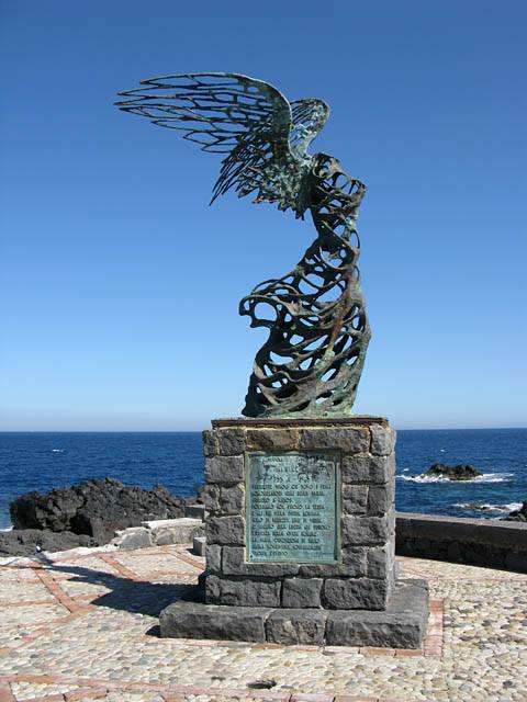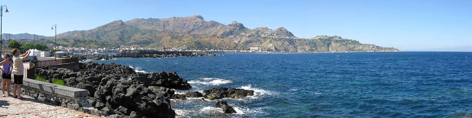 At Naxos an ancient lava flow goes all the way to the sea. Here we found a nice sculpture and views across the bay to Taormina to the North. | Taormina from Naxos. | A beach at Naxos. |
