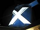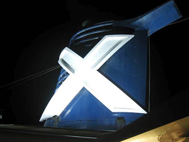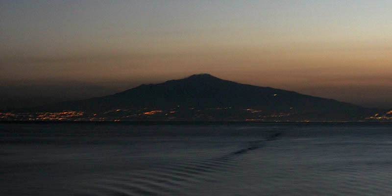 A long exposure of Mount Etna in the deepening twilight as we cruise away into the Ionian Sea. | The 'X' Celebrity logo lit up in the night on the engine exhaust funnel. |