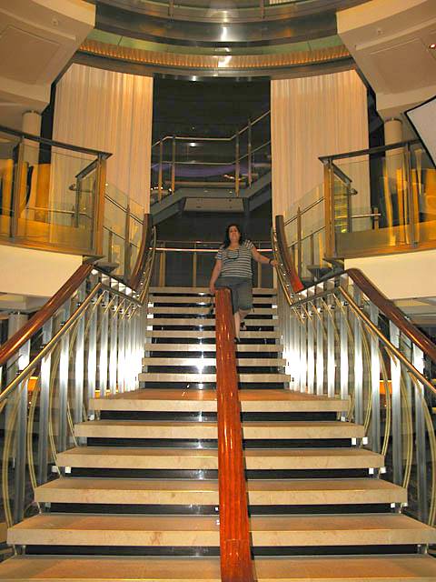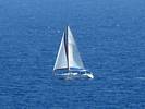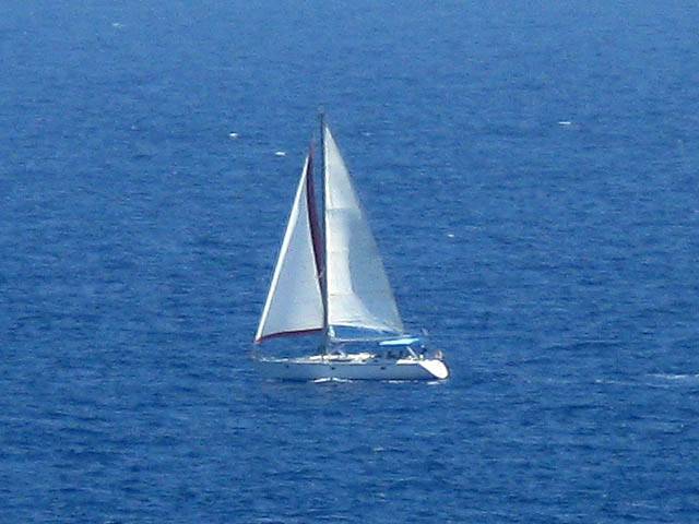 Renée on the grand staircase during the afternoon. | At one point a small yaught passed fairly close to us as we started to go round the Southern tip of Greece. |