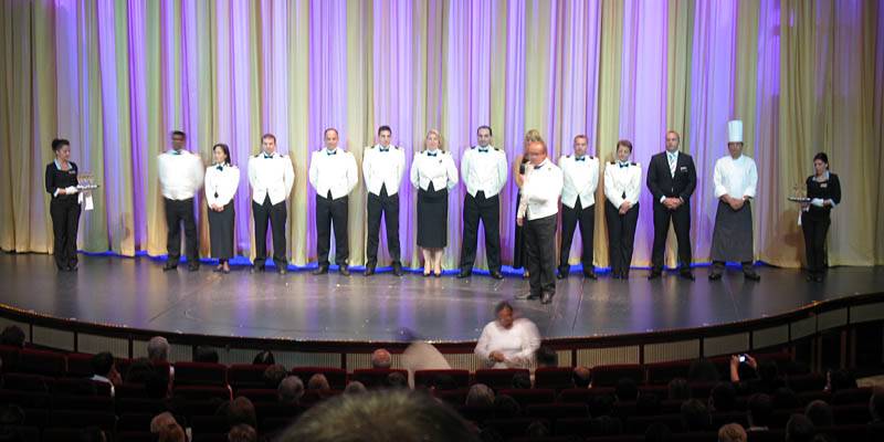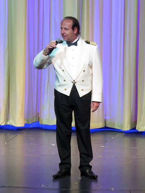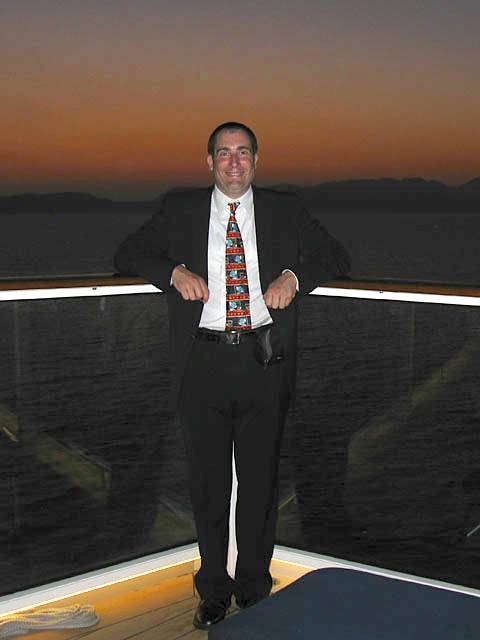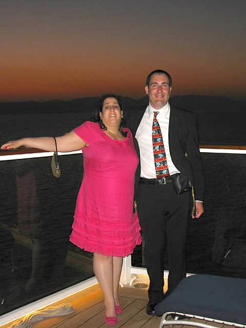 The captain's toast in the Equinox Theater. | The southern tip of Greece being silhouetted in the twilight. | Renée and I posing in the twilight. |