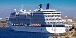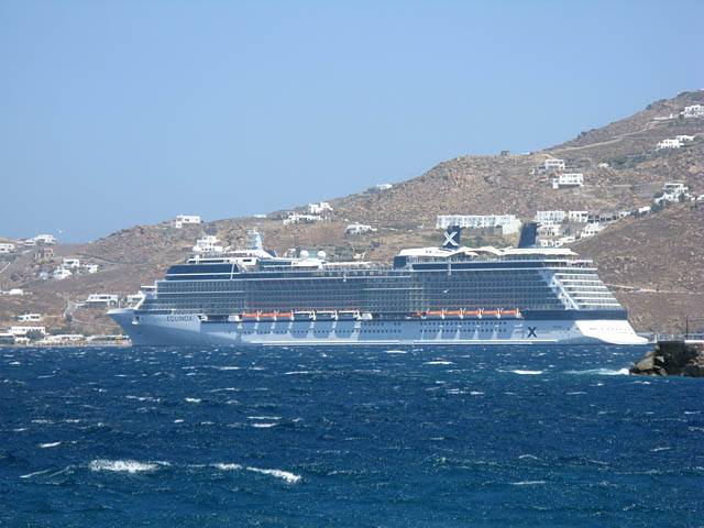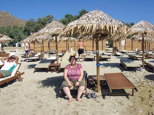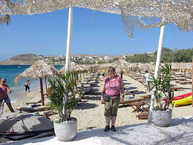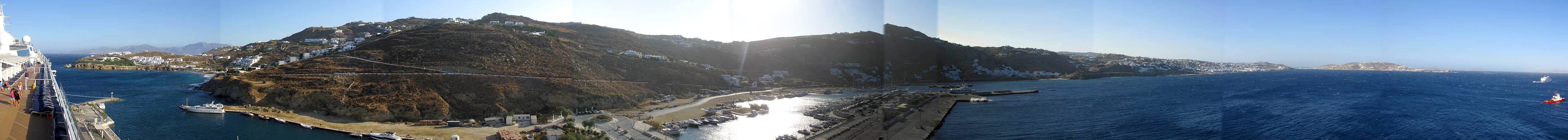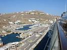 I woke up at 5AM. At that time the ship was rolling heavily and the wind was howling. It was pretty much as expected. It seems the sea is generally rougher around Mykonos. Renée was up soon after me. We were fine but could only imagine how some of the more queasy passengers were doing. In the morning twilight we looked out to see Mykonos approaching. By 6AM the thrusters were starting. No more sleep for us! Outside at 6:15AM we saw white buildings and a beach. We went for a leisurely breakfast at 7:15AM and then as the sun got higher we went up to the Lawn Club and I took some pictures before we returned to the room to prepare for the excursion.