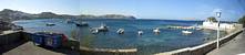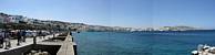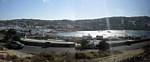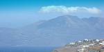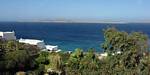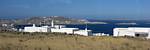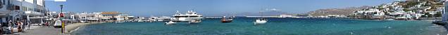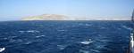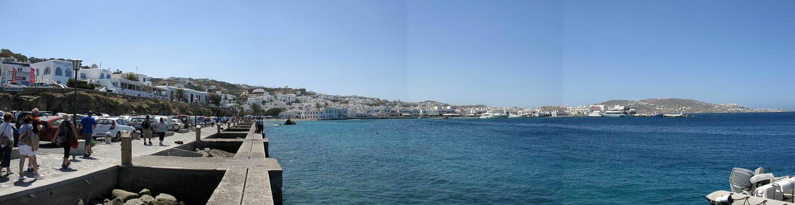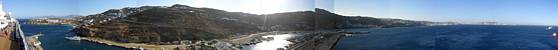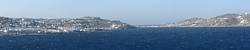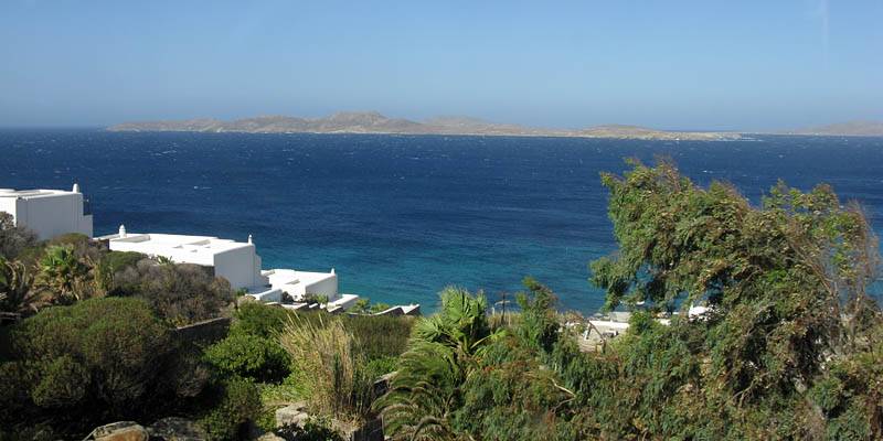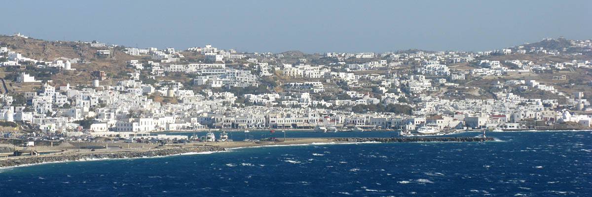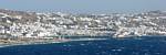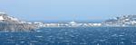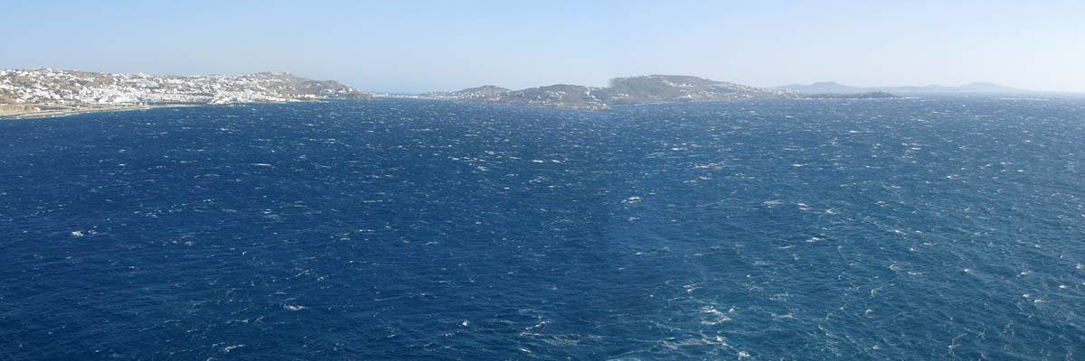 180 degree panorama of Mykonos from a brand new port at Tourlos just North of Mykonos Town. | Looking Southwards across choppy waters to Ornos where a thin strip of low lying land joins Kapari to the rest of the island. |