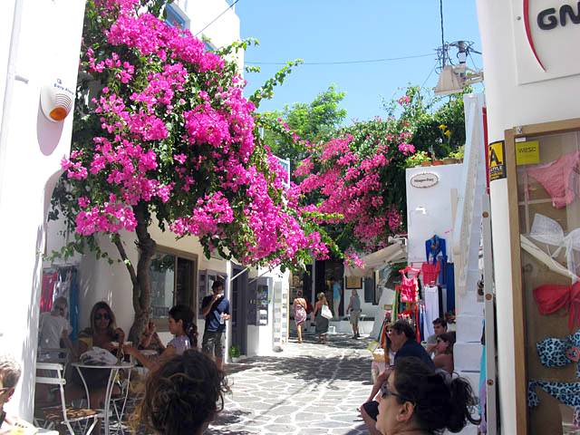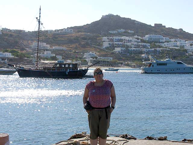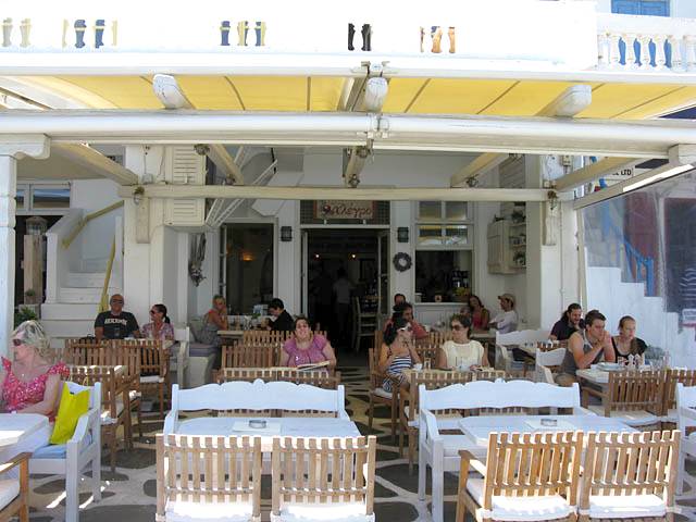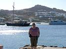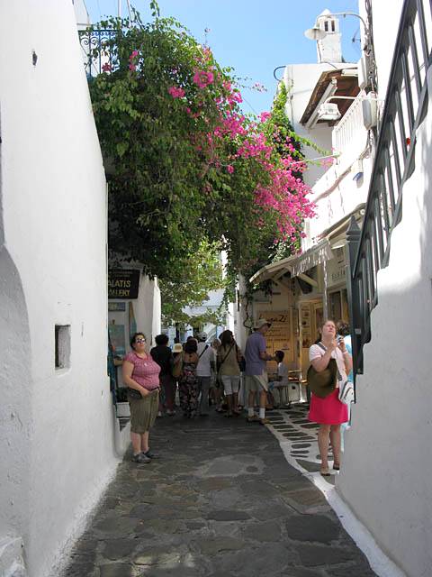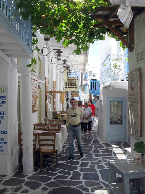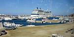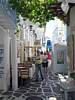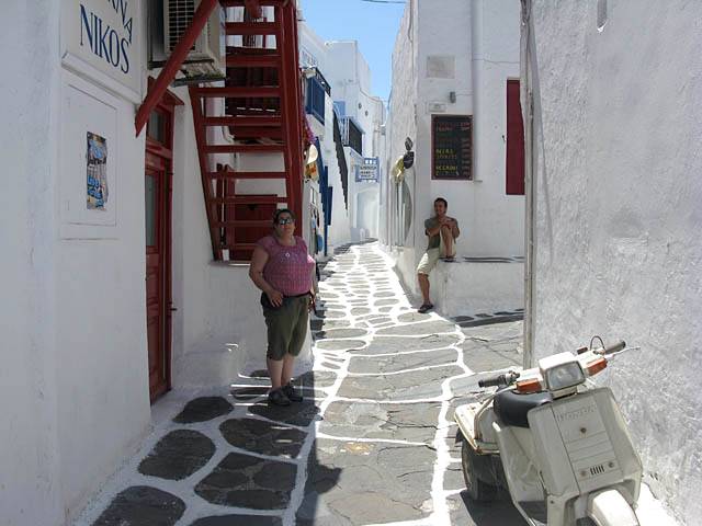 We walked along sea front. Here I bought a fridge magnet. We also bumped into Jane and family who were also wandering around Mykonos Town at the same time. We then stopped at the Alegro restaurant for Tzaziki, houmous, bread and chips. (I just had the latter two to keep me going until we got back to the ship as the menu wasn't to my taste.) It was very windy and we had to be careful it didn't blow our meal away. The food wasn't great and very expensive but never mind. Atleast Renée got her Greek Mezzé. We soon carried on and went for a walk around the alleyways of Mykonos Town until 1PM. Then we returned to the drop off point where we were able to catch a shuttle bus back to the ship.