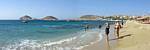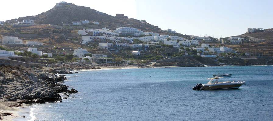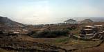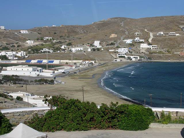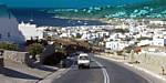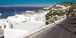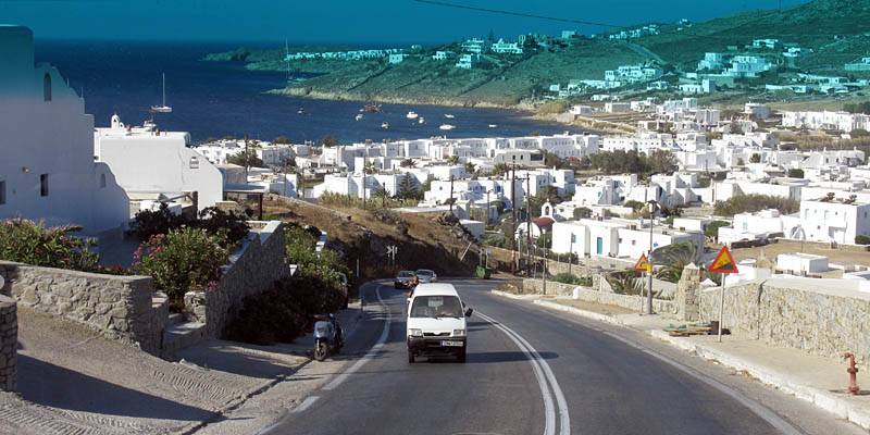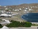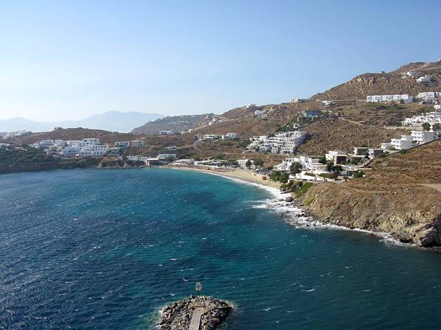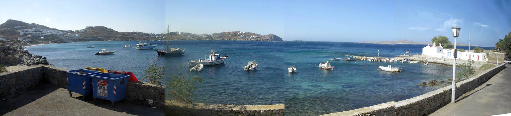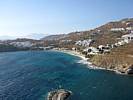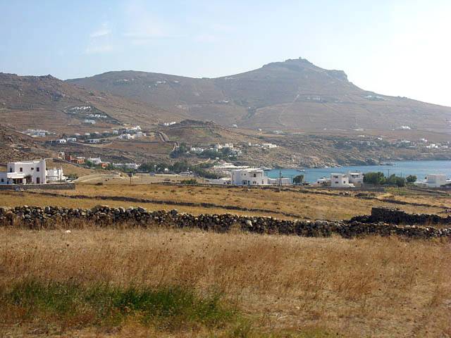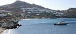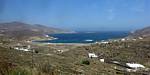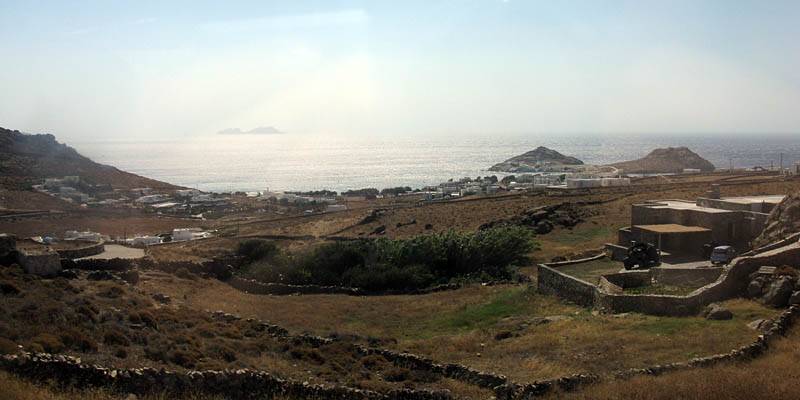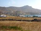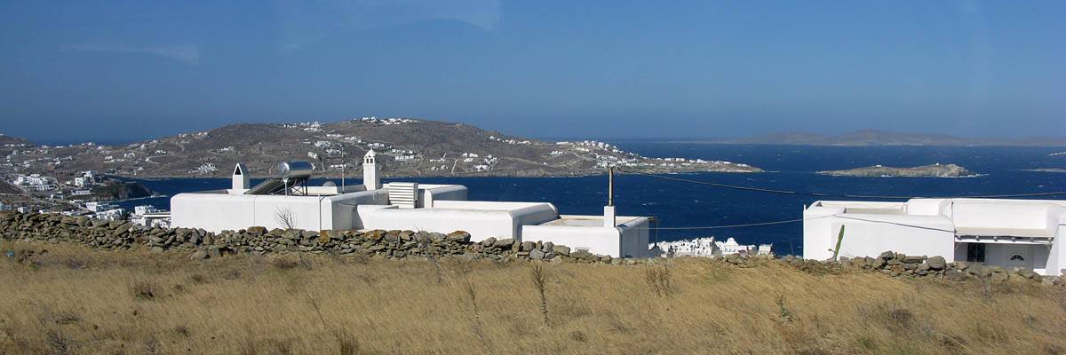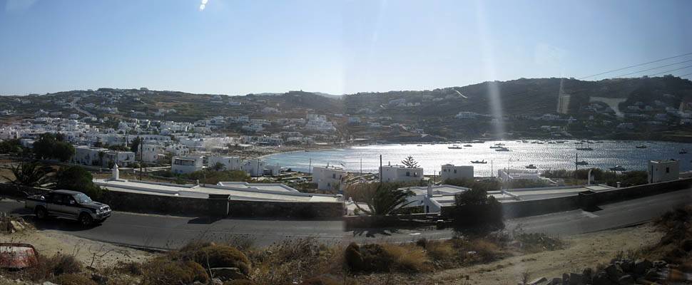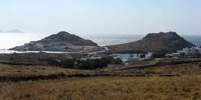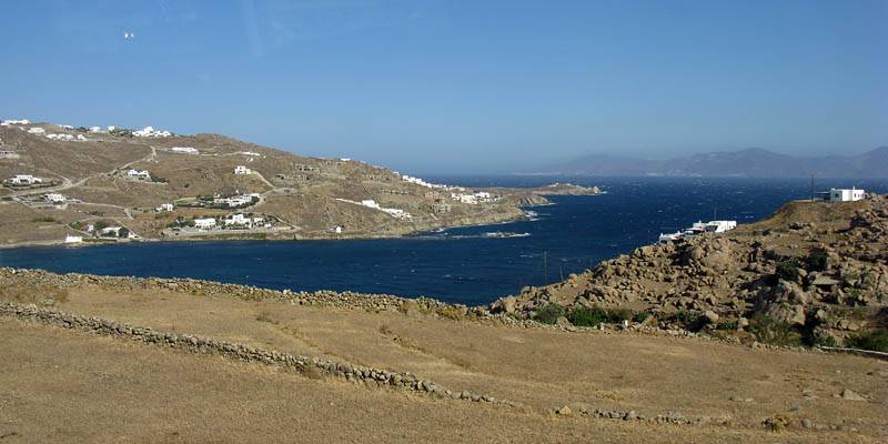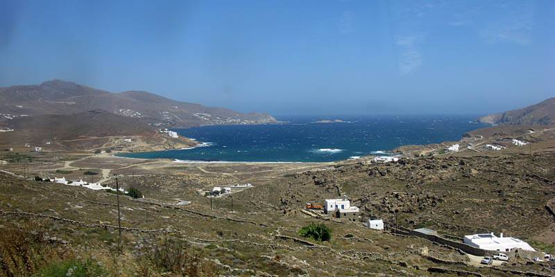 Looking back at the Equinox and across the sea over the top of Mykonos Town as we set off Southwards on the bus. | Korfos Bay. | Heading down to Ornos. |