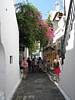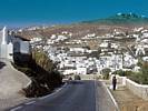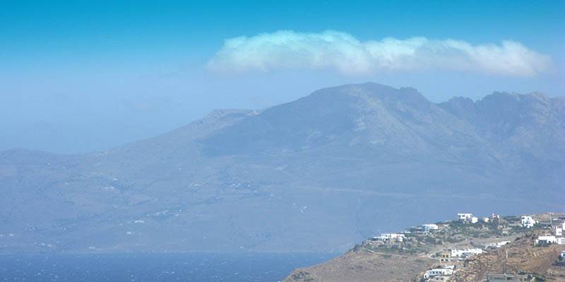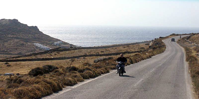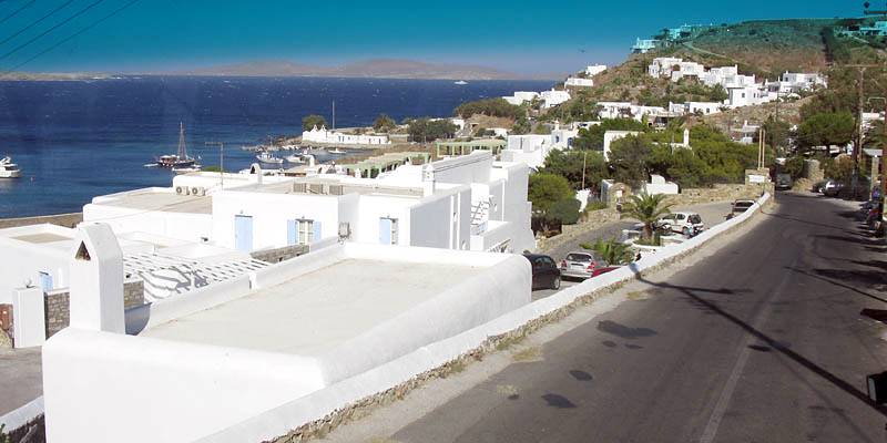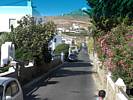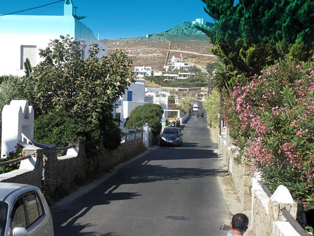 The North side of Ornos, facing Korfos Bay. | Taking a narrow road through Ornos. | The more sheltered South side of Ornos, facing Ornos Bay as we climb away towards Kapari. | Approaching Kapari and Agios Ioannis (the Shirley Valentine beach). Across the sea to the West is the island of Delos where a huge archealogic site exists, and is the birthplace of Apollo and Artemis. Beyond Delos is a bigger island called Rineia, and in the distance to the Northwest is the island of Tinos. |