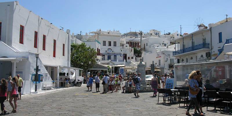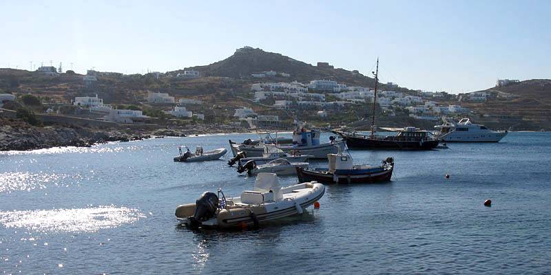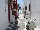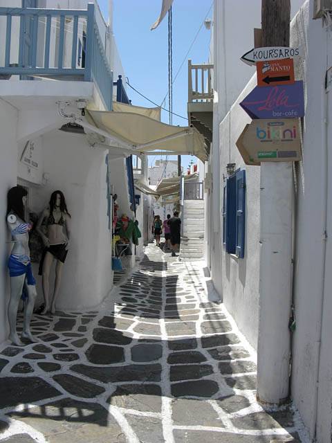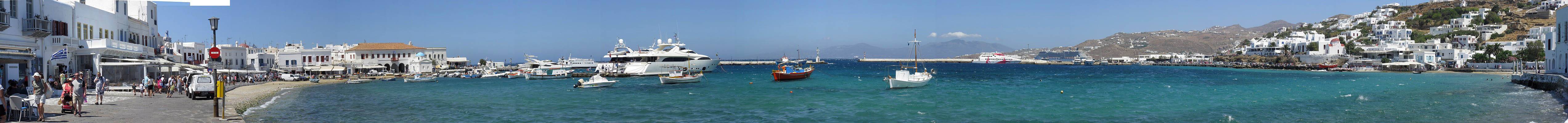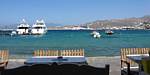 Looking Southwards from the drop off point into Mykonos Town and beyond. | Mykonos Town alleyway. | A view of the harbour in Mykonos Town. Equinox in the background as well as Tinos across the sea. |