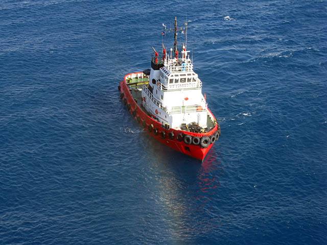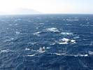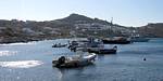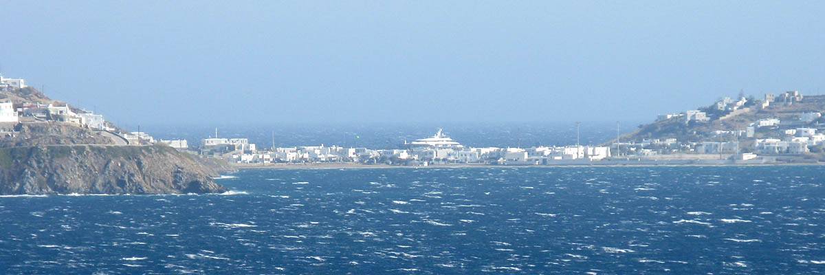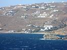 Another very choppy view South towards Ornos. | Tug boat getting ready to escort the ship away. Note the faint rainbow from the sea spray near the bottom. | Mykonos Town and a long range shot of Ornos as we prepare to depart from Mykonos. | Looking North from the Tourlos pier to the Agios Stefanos beach. |