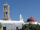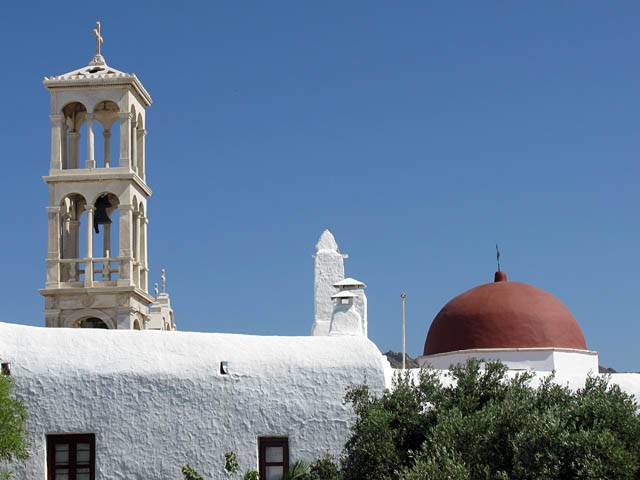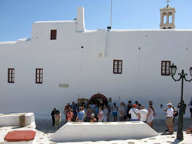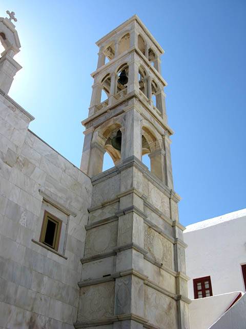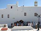 At about 10:20AM we backtracked to Ano Mera after drying off and getting most of the sand off our feet. We stopped at the monastery. Inside a classic Mykonos white shell was a pretty marble building with an ornate bell tower. At the entrance sat a monk who has apparently been there for 62 years since he was 11. Inside was a very ornate interior including a spectacular Greek Orthodox partition on the Eastern side. Apparently one of the icons on the partition was found washed up in the 19th century in Tourlos, which is where the new port is now and where the ship was docked.
