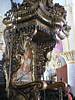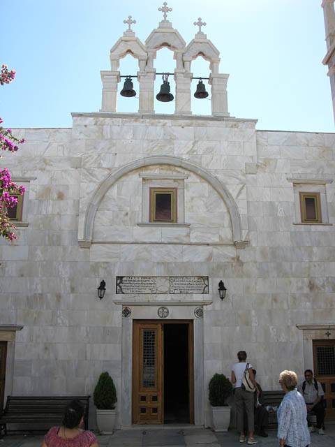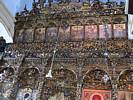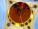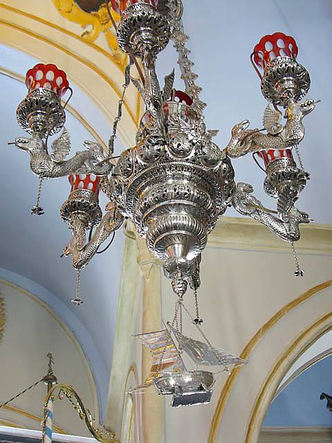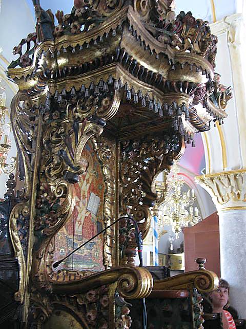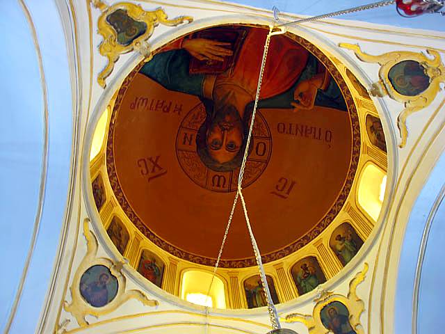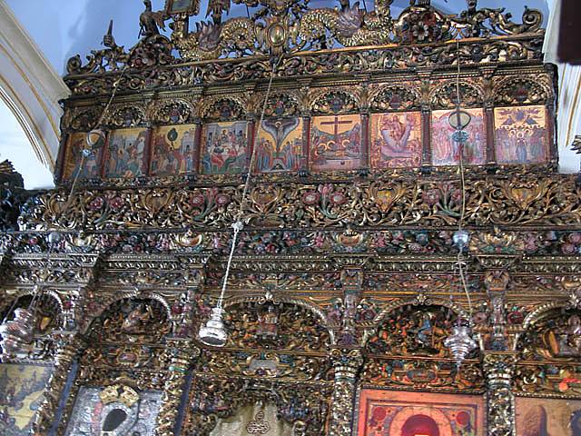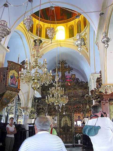 Looking around inside. No flash. | The partition between the main area and the holiest section to the East. To the bottom left is the icon that was found in Tourlos. | The underside of the dome. | A heavily decorated chair. | A chandelier. | Emerging back out of the monastery. |