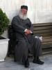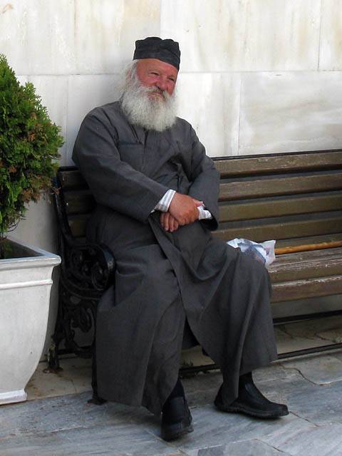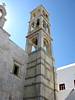 Leaving Kalafatis Beach behind. | Parking up in Ano Mera outside the monastery. | A closer view of the bell tower and dome. | Inside the outer shell lies an ornate marble creation. | The monk who has been here for 62 years. |
