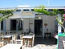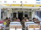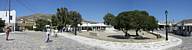 The place where the Mezze and Ouzo was served. | Renée enjoying the Mezze. | Panorama of the square between the Mezze place and the monastery. |