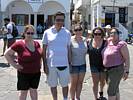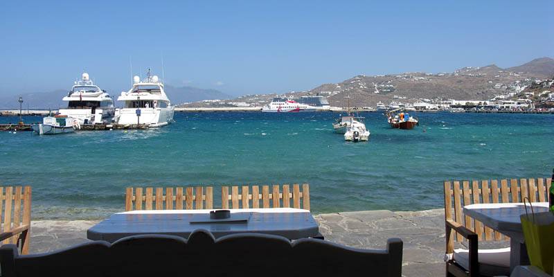 Renée with Jane, Gary, Amanda and Gemma in Mykonos Town. | Looking away from the harbour. | The Alegro restaurant and the view from the table. | The view of the Equinox from the restaurant. |