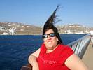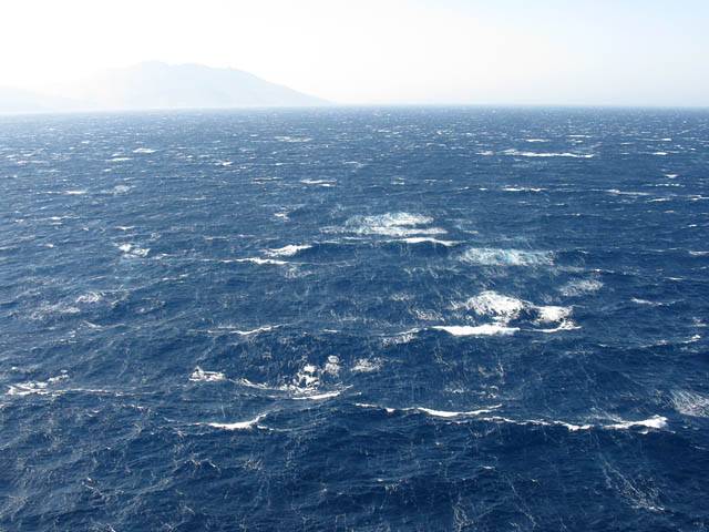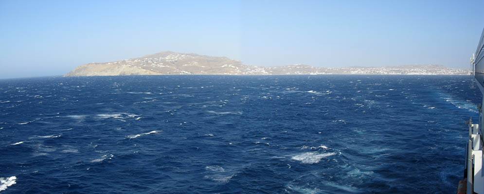 Boy was it windy! | Departing Mykonos. | Now we are moving into wind it really is howling! Once at speed and given the captain's forecast I reckon the headwind was maybe 50kts. | Noulakia Bay. | Rough seas ahoy! Even the mighty Equinox was moving around quite a bit. | One last look back at Mykonos as it recedes into the haze. |