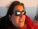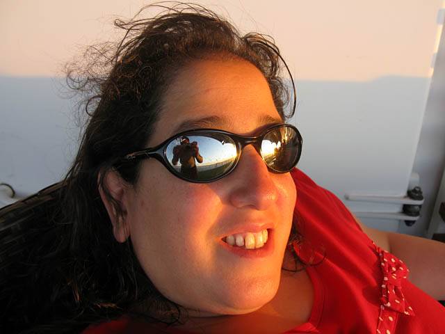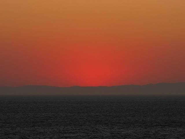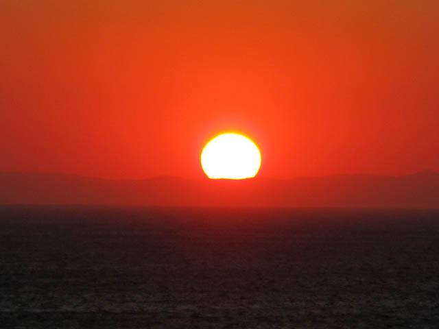 Renée lit up by the sunset. Hah I can see myself in her sunglasses! | The sun setting behind a distant greek island. Not sure which. Could have been Serifos or Kythnos maybe? Or Apollonia? (Looking at Google Maps). Either way it's just as lovely and atmospheric as the others that we have seen already. |