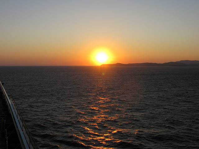 We went down to Silhouette at 6:20PM. I grabbed a map of Santorini while waiting for Silhouette to open. Inside I chose Sea Bass which was not bad. I had Fruit Medley to start and a sickly chocolate mirengue for afters. We were finished by 8PM. I spilt water on Santorini map when I knocked a glass over mid meal so afterwards I went to get another. Then we went to the Lawn Club. From there we watched sunset at 8:35 as it sunk behind another distant Greek Island. We were surrounded by lots of different islands at this stage.