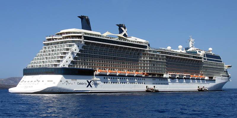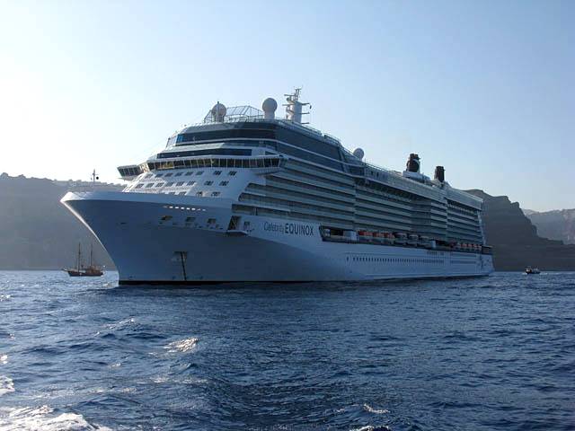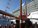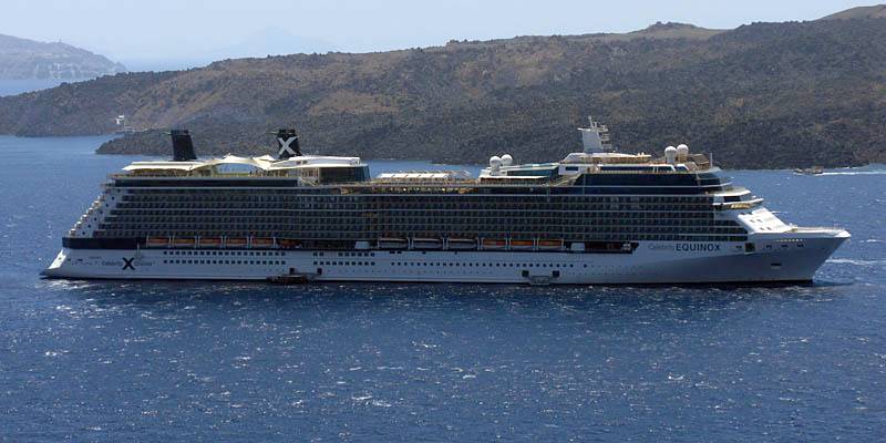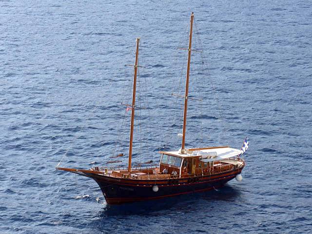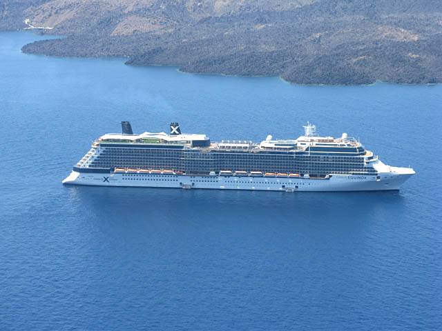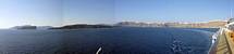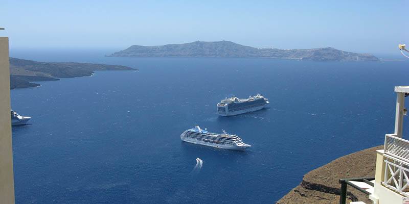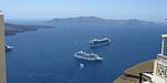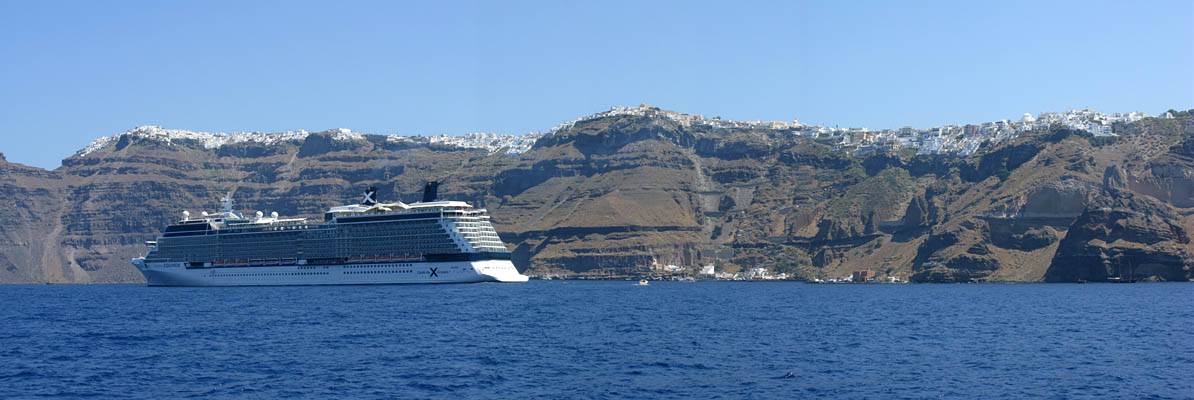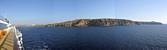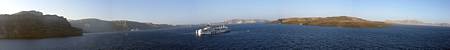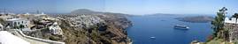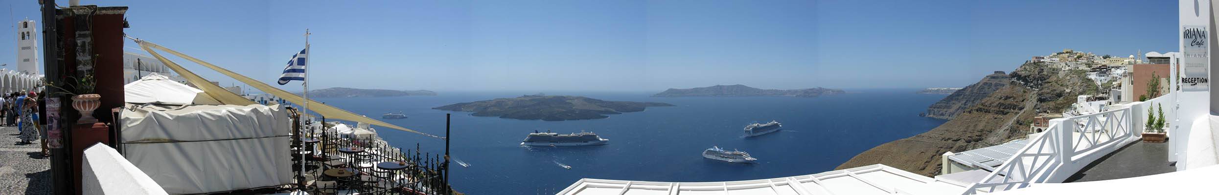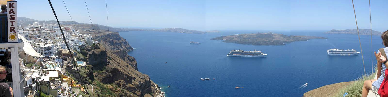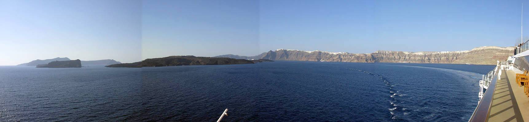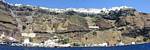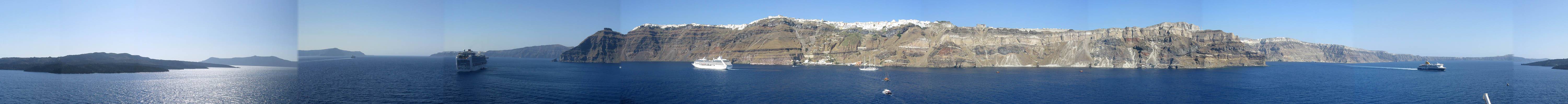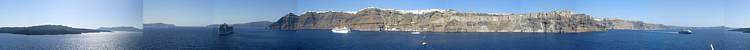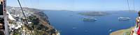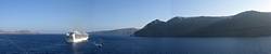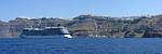 Another panorama looking Northwards, past the Crown Princess cruise ship to the gap between Thirassia and the northern end of Thera. | One of several cool looking wooden boats. | Looking back across the Equinox from Deck 15 Fwd towards the cliffs south of Fira, the capital of Thera / Santorini. |
