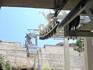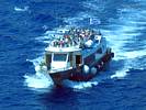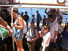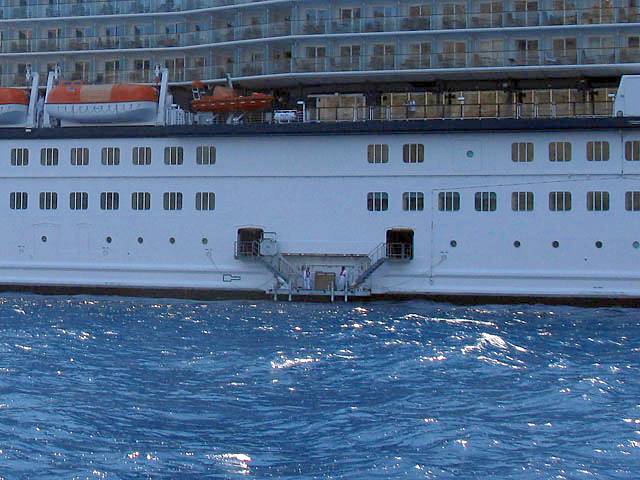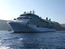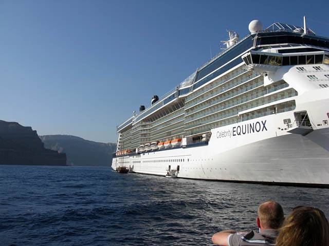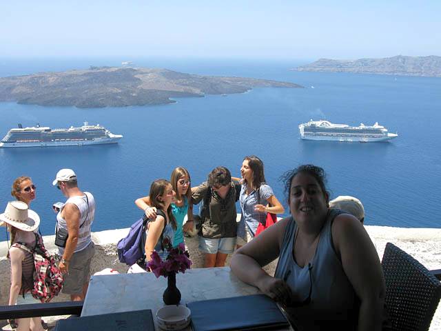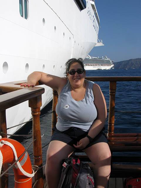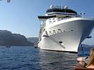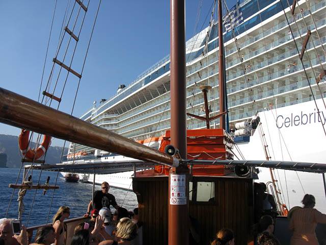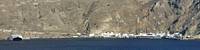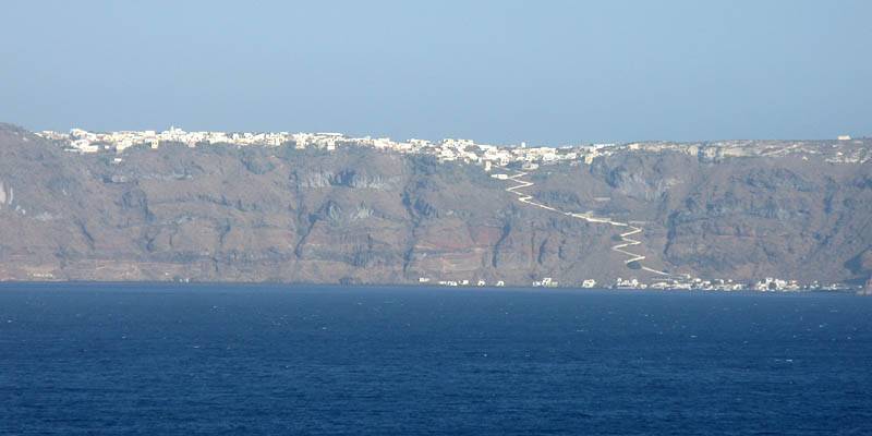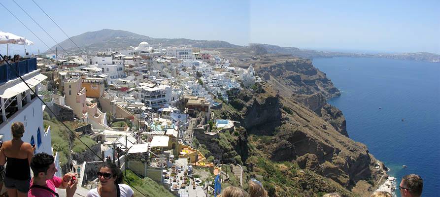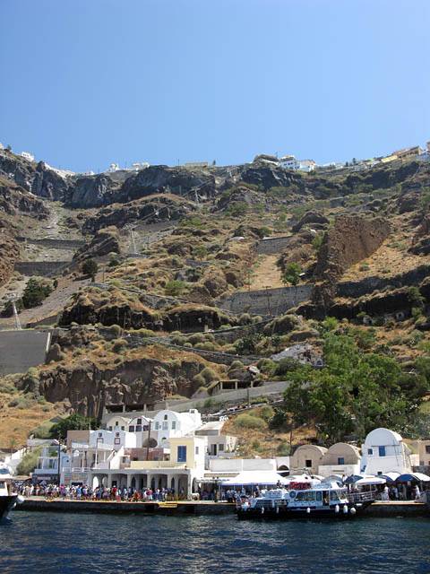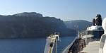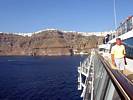 The best external view of the Equinox yet. | Panorama of the Southern half of Fira. | Fira's port at the base of the cliffs. Still waiting to dock. | This shot focusses on the cable car and donkey track linking Fira to the port. | Getting off the boat. We docked at last. |