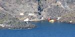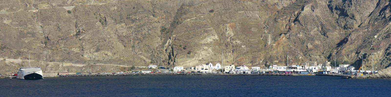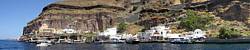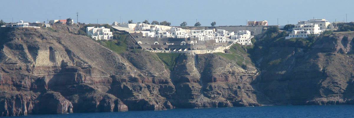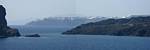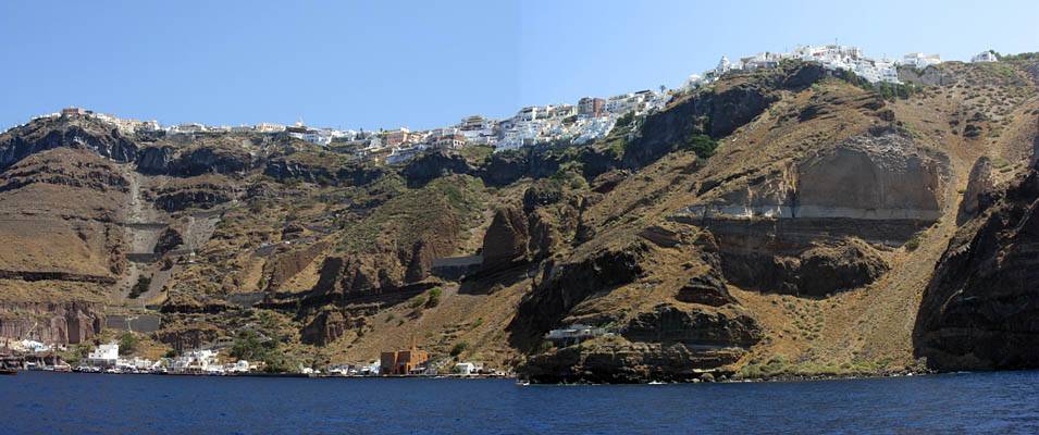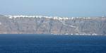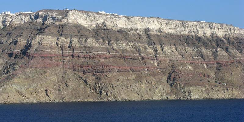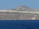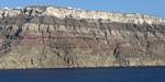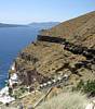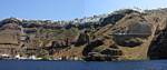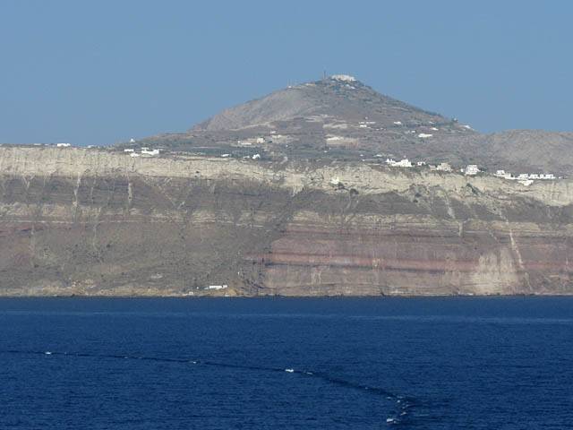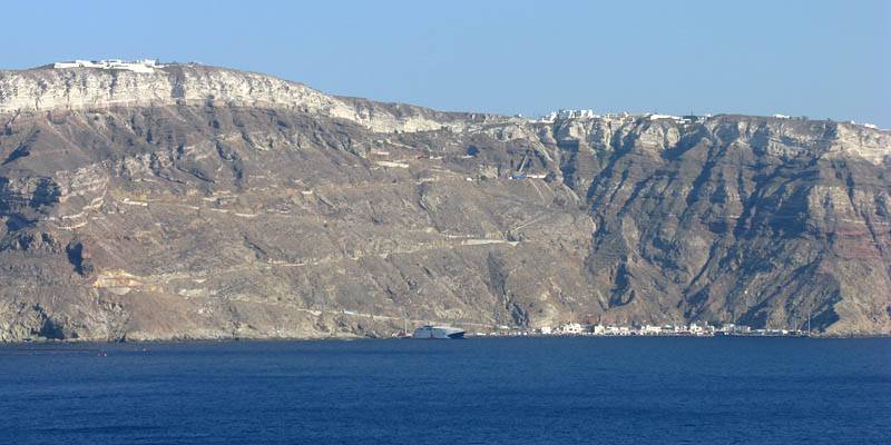 A closeup of the receding Athinios Port. | Focussing on remarkable layers in the cliffs South of Fira. A slice through time into a violent geological past. | Buildings along the Southern part of Thera. I think this is part of Akrotiri. | Looking back at Palea and Nea Kameni, Thirassia and Thera, as we exit West. | Looking through the gap betwween Palea and Nea Kameni towards Oia. The more distant hills belong to the island of Ios. |
