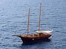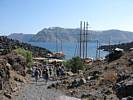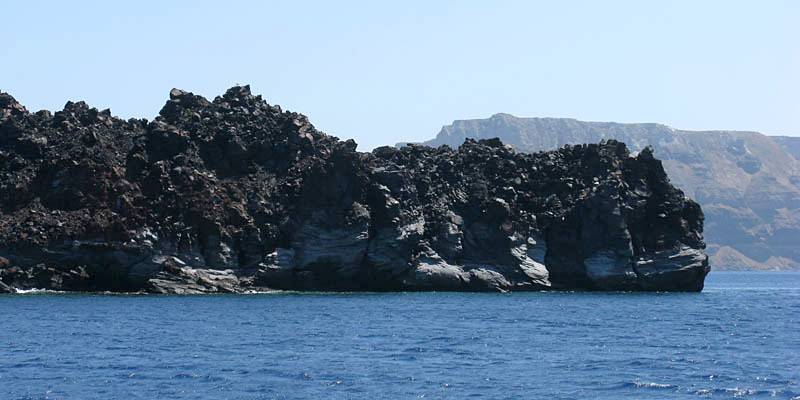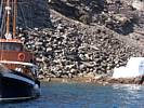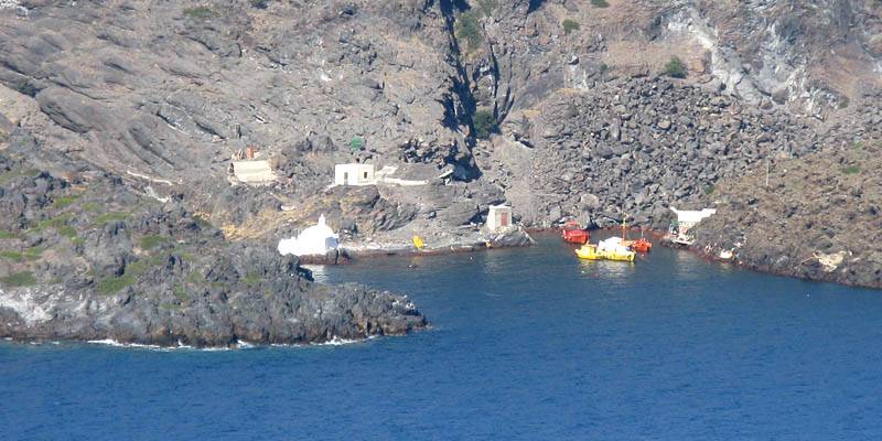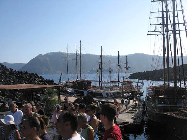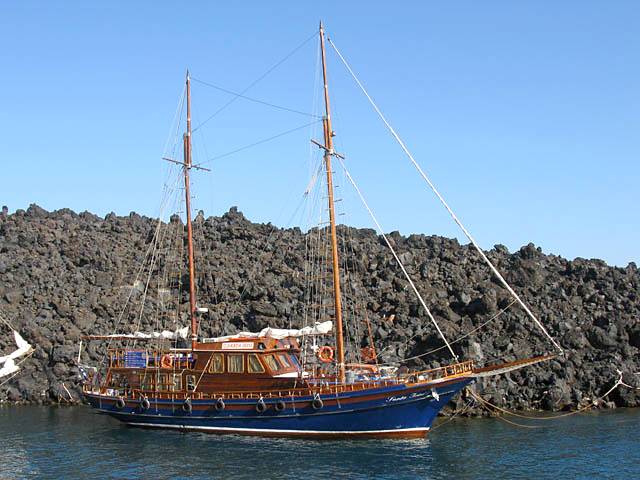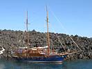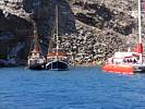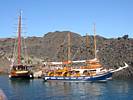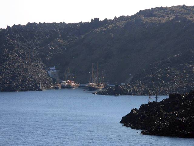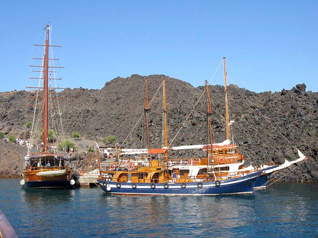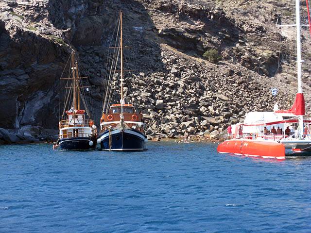 Approaching a very rocky Nea Kameni. | Other wooden boats already docked in Erinia Cove. The large lava blocks apparently making good tie points. |
