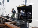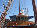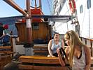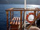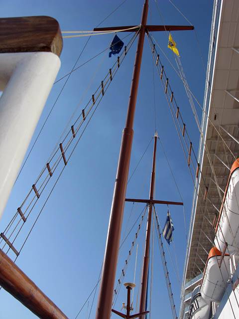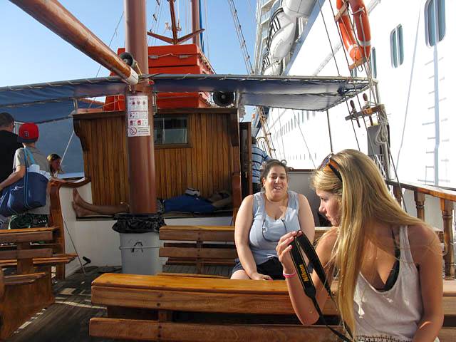 The docking platform that allowed us to cross to the Aakyon. | Looking around the upper deck of the Aakyon, a cool wooden ship, as we leave the Equinox behind. There certainly is a great view up here. |