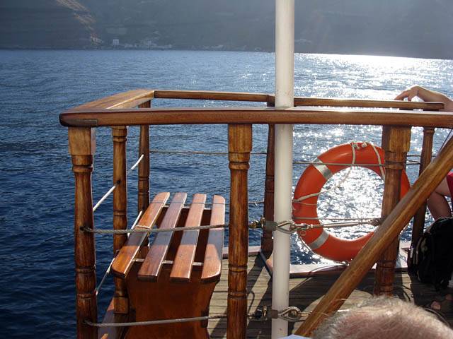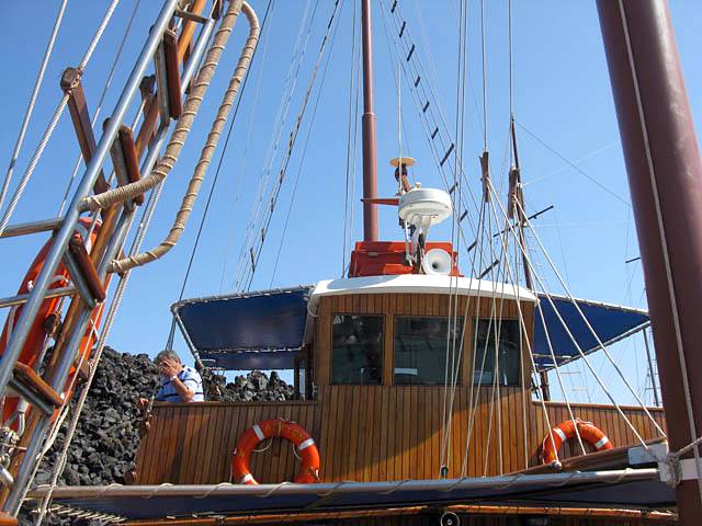 We boarded the tour boat at 8:45AM. This was our first boat to boat transfer of the cruise. The excursion boat was a cool wooden boat with high masts, called the Aakyon. It was a fun and very rocky ride to Nea Kameni with spray blowing onto the boat and soaking us. I used my hat to shield the camera from getting wet.
