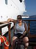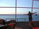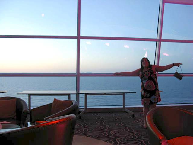 One more picture of us as twilight changes the mood of the room again. | Renée posing by the panoramic windows. | I wonder what this guy is thinking about? | Renée with another senior crew member. | Distant islands lit up by the twilight. The islands might be Milos but not sure. |