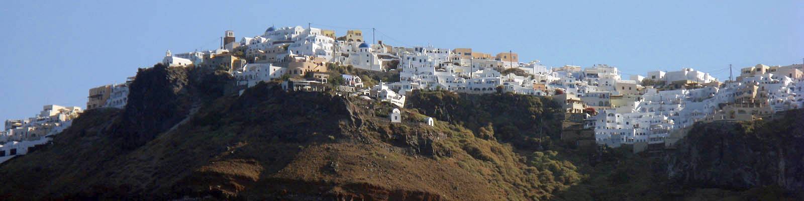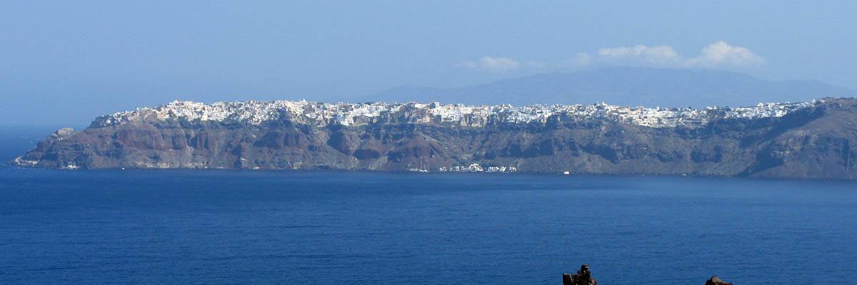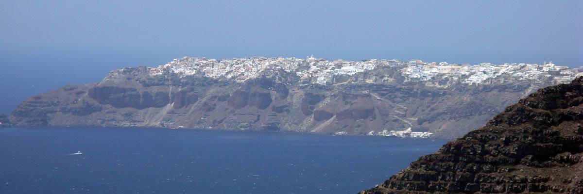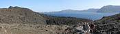 Panorama from near the church taking in both tips of Thera, Nea Kamenia and Thirassia, giving a sense of scale to the whole archipelago. | The Southern Firan suburbs. | Looking back the way we came. | Looking North to Oia. | Returning through the alleyways. |