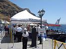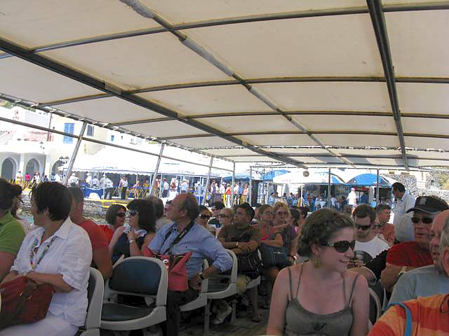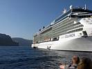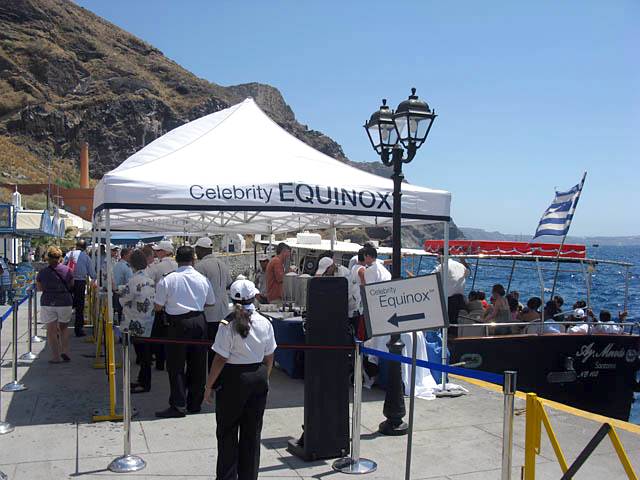 The Equinox dock in the port. | Boarding the shuttle boat. | Leaving Fira behind. | Approaching the Equinox docking ramp. | Another shuttle boat seen later on from the Oceanview Café. |