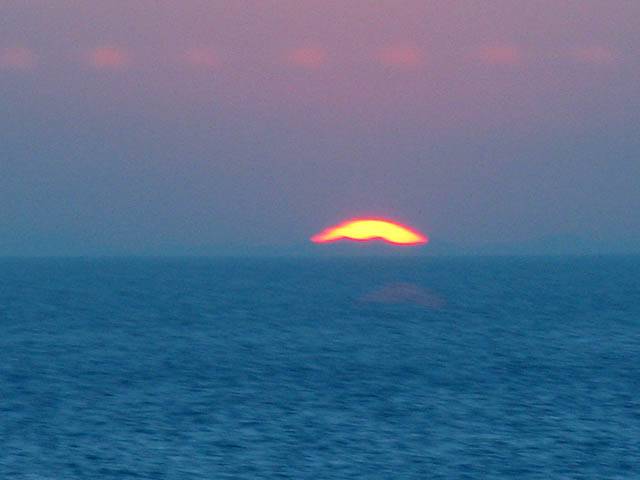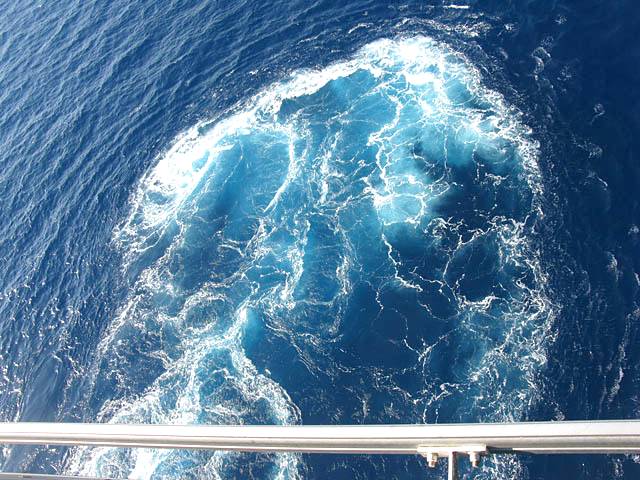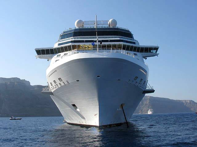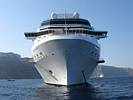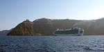 We then went down to the room after a short while to rest. At 5:30PM I shaved. Then I heard the anchors being raised so I rushed my evening wear on and hot footed it up to Deck 15 Fwd to see us depart Santorini. The ship went round the volcano before departing westwards. The forecast was for a 20kts Northwesterly wind and slight seas tonight. A relief after rough seas the last 48 hours or so.