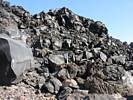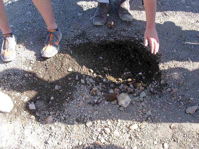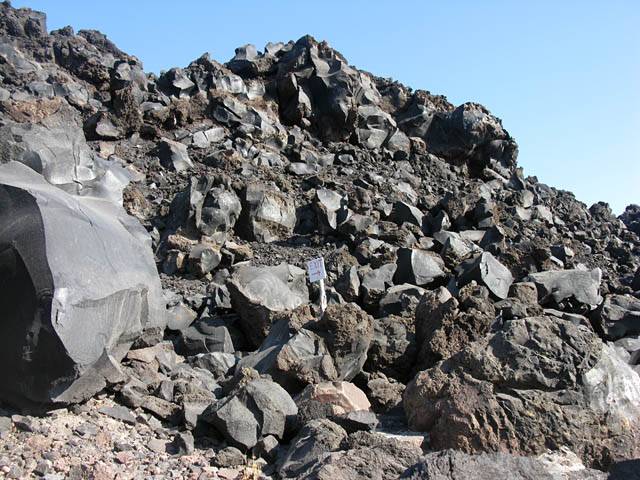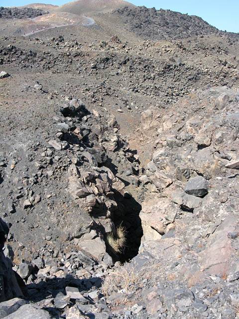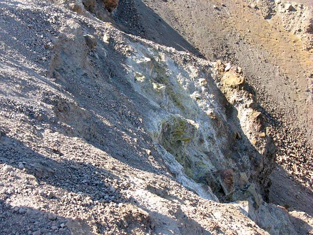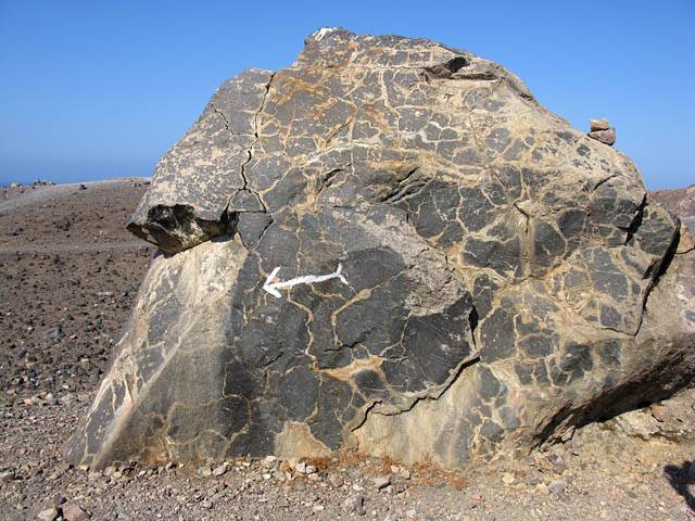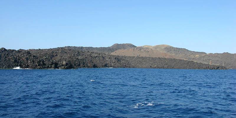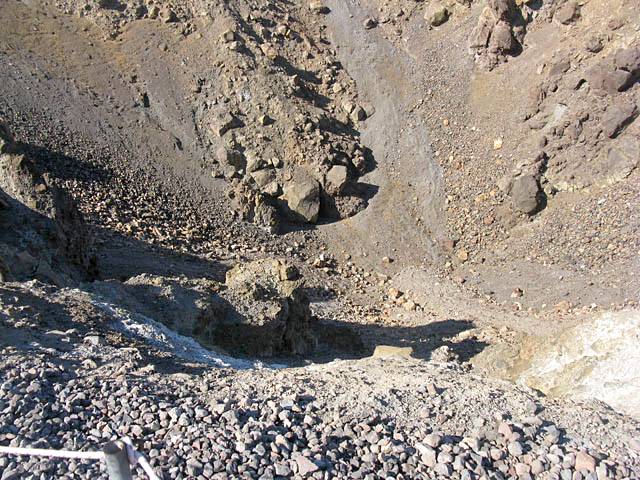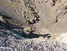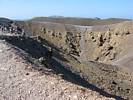 A few centimetres between our feet the ground is baking hot. Sea water absorbed by the porous island steams out of a small hole dug in the path. | Looking down towards the fumaroles beneath the path. | A closer look at a fumarole. It smells rather sulphorous here! Sulphur and gypsum crystals can be seen deposited around it. | Looking out past a lava bomb and back to the Equinox. | Lava bomb with characteristic network of cracks as the surface cooled rapidly in mid air while the inside cooled more slowly. | Looking Southeastwards. Below is the freshest lava from the last eruption in 1950. In the distance is the Southern half of Thera. |