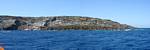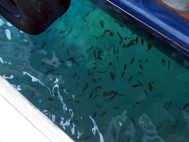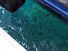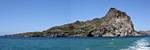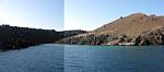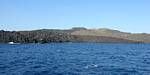 The fish sheltering under the boat. | The Aakyon's bridge from the front of the boat. | Approaching the cove on the Northeast side of the island where the hot springs are. (Well more gently warm at approx 33C.) | Looking into the hot springs area. We will swim there after jumping in near the boat on the left. | A panorama of the hot springs taken after we got back on the boat after swimming, before we left. |