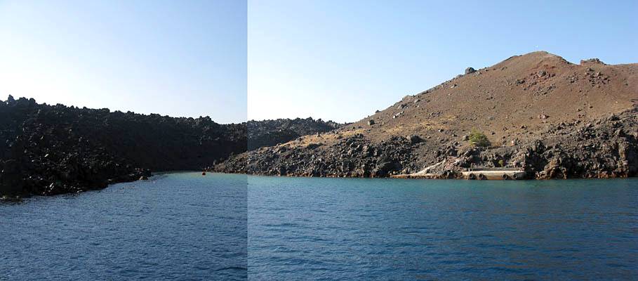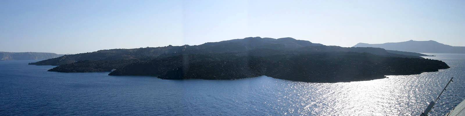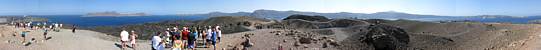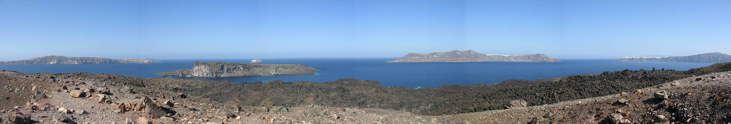 Looking down the the hot springs harbour where we will go for the next leg of the trip. The hot springs are in the cove on the left hand side (hidden from view). | Oia looking spectacular in the distance. | A 360 degree panorama taken from the summit of Nea Kameni. I stood on the summit stone for this one. East is roughly Centre. |