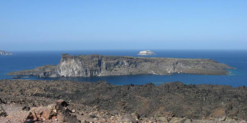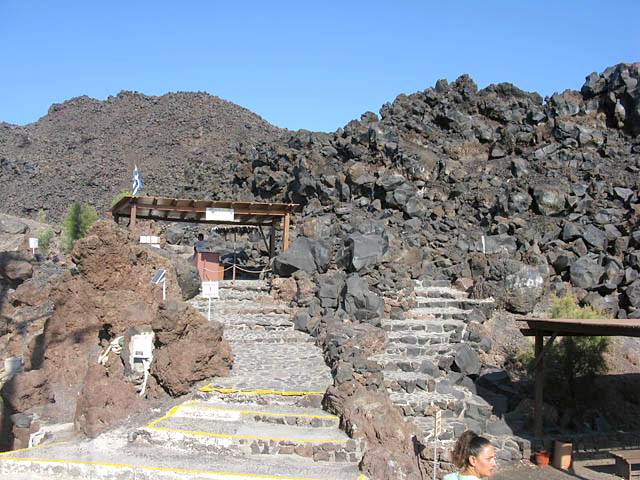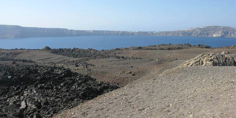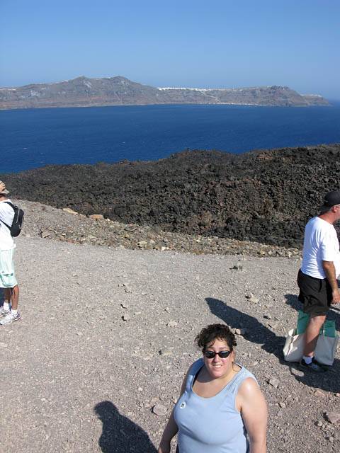 The Volcano Hike lasted for about 1.5 hours until 10:30AM. During that time we docked at a small jeti in Erinia cove and were split into several smaller groups. We walked along a path in three segments, pausing for breath at Mikri Kameni and Daphni craters and then walked around the top. The landscape was desolate with lots of lava blocks everywhere and little vegetation. For me it was a gentle stroll. For Renée it was much tougher, but she made it to the top at least. At the top was a network of active craters. The central crater had sulphurous fumerols. The gases were faint but enough to make Renée feel a little queasy. Also someone dug a small hole to demonstrate that a few centimetres beneath our feet the ground was hot and damp. The water was absorbed sea water (permeable rock) and was steaming out of the hole! We circumnavigated the active crater, pausing at a nearby large lava bomb, until we reached the highest point at the summit. Near the bomb I saw a hare on a fairly fresh lava flow below us. Near the summit I picked up 2 small lava blocks. It was a great view here with the main islands in an oval all around us. I stood on the summit stone and took a 360 degree panorama. Then we returned back down the path that we had ascended, to the boat.