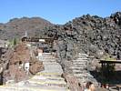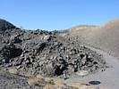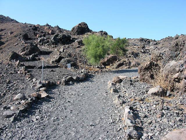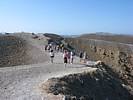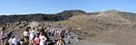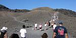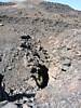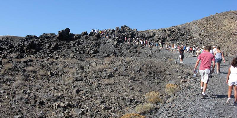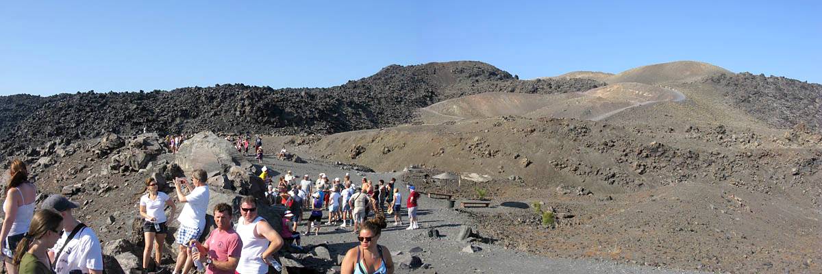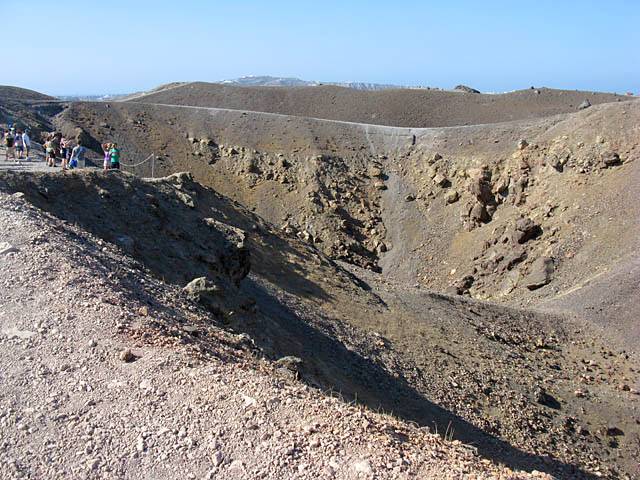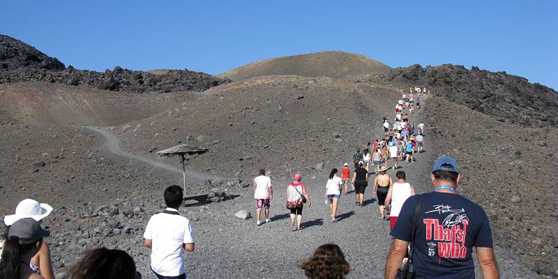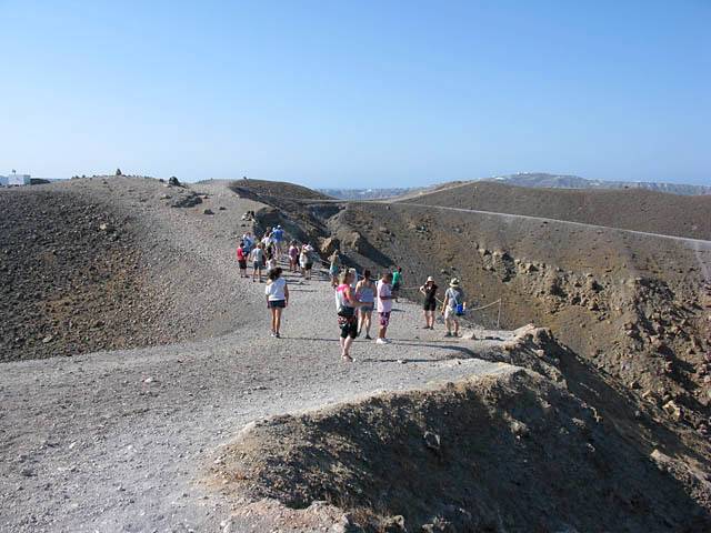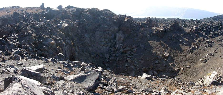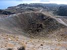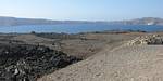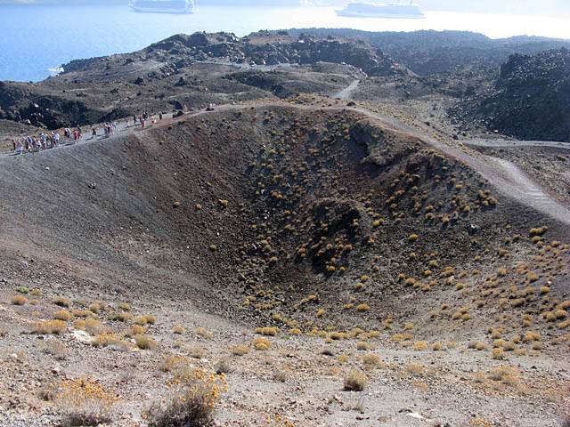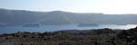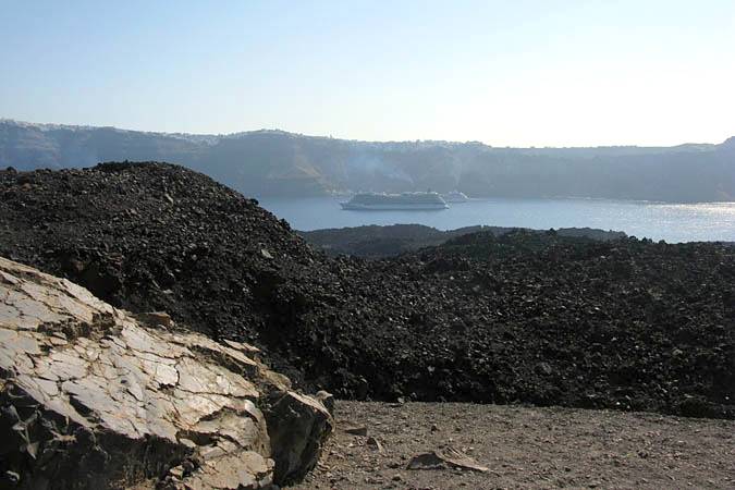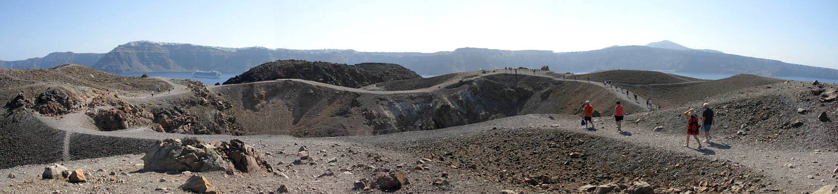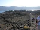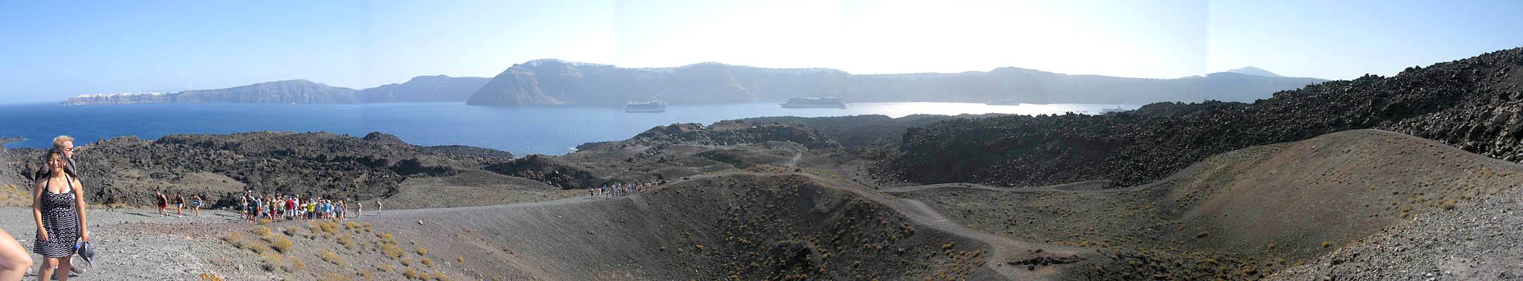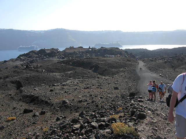A panoramic view Eastwards from Daphne crater. This part of the island was created in 1925-1928. Mikri Kameni and most of the Northern half of Thera visible in the background. | The path to the summit. | Looking inside Daphne crater. Mikri Kameni visible in the background. | Closing in on the summit. | A closer look Eastwards. Crown Princess, Equinox and another ship in the caldera, with Fira dominating on top of Thera in the background. |