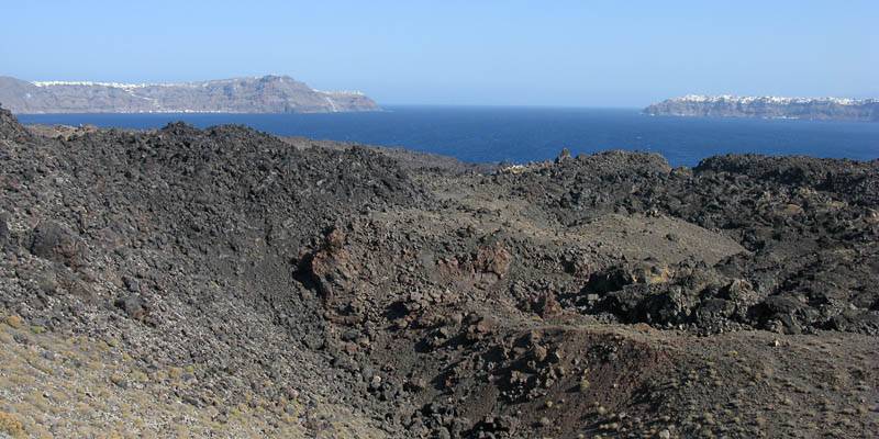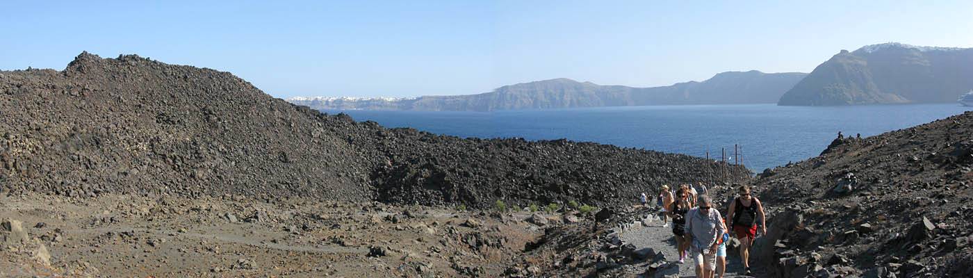 Pausing at the Mikri Kameni crater. This is the oldest part of the island created in 1570. | The path to Daphne crater. | Looking back over the barren craggy landscape towards the ships. Fira in the background. | Looking North, Thirassia and Oia can be seen. |