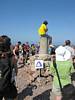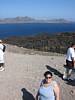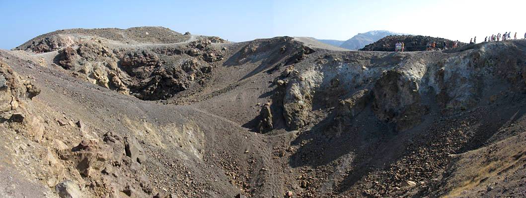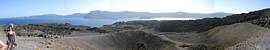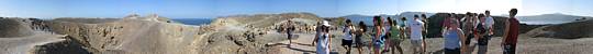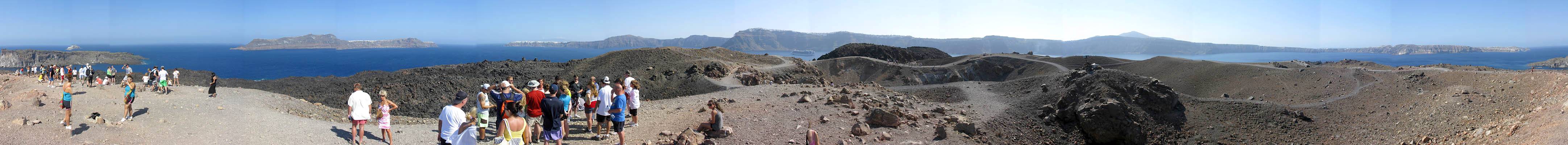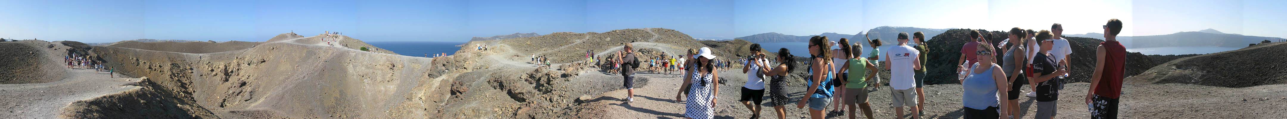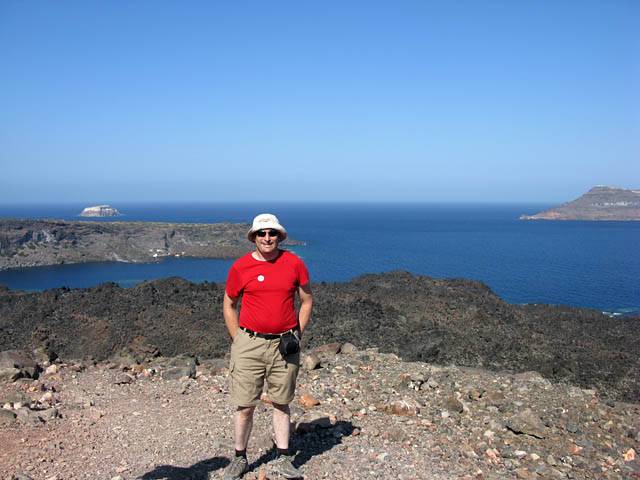 Looking back across to the fumeroles as we circle clockwise round the South side of the crater. | The summit of the island, on the West rim of the active craters. This is the peak of the Georgios Dome, formed in 1866-1870, in which the active craters sit. | 180 degree panorama centred to the West. In front is Palea Kameni, with the small island of Aspronisi lying beyond. To the left (SouthEast) is the Southern tip of Thera. To the right (Northeast) is Thirassia and Oia on the Northern tip of Thera. | Palea Kameni and Aspronisi. | Mike on top of a volcano with the view Westwards behind. |