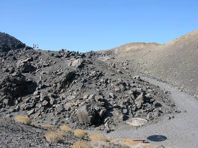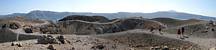 One of a pair of active craters at the summit, complete with fumaroles. Formed in 1940 by two large hydrothermal eruptions (sudden release of steam). | A 360 degree panorama of the active summit craters. We are on top of a dormant volcano! | The path continues past the fumaroles and between the two active craters. |