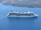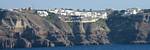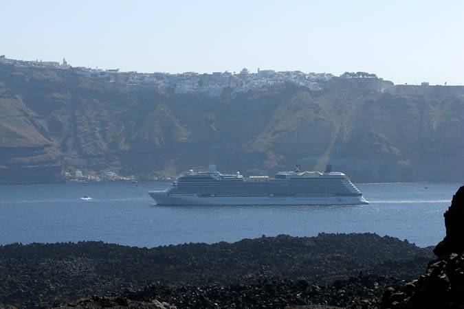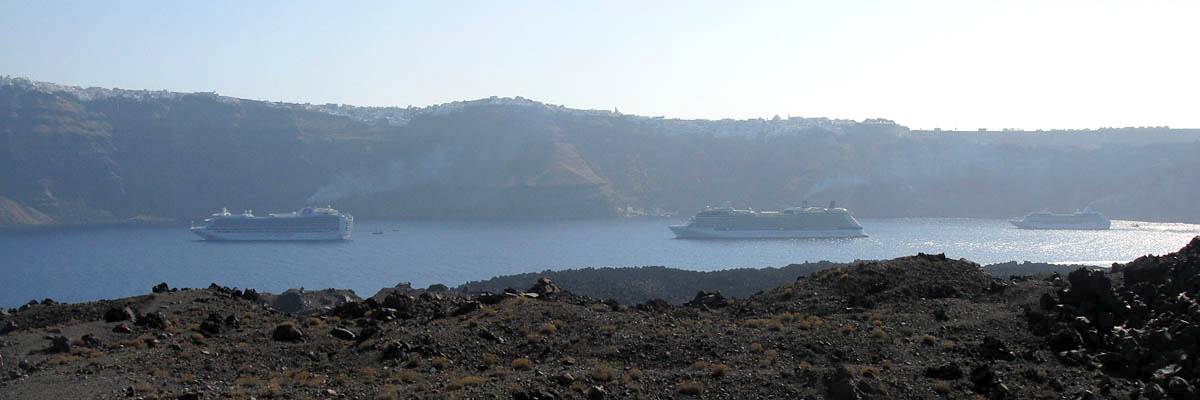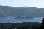 The Northern half of Fira. | Views of the Equinox as we motor past the front of the ship towards Nea Kameni. | The Crown Princess in front of the cliffs on which Fira sit. |