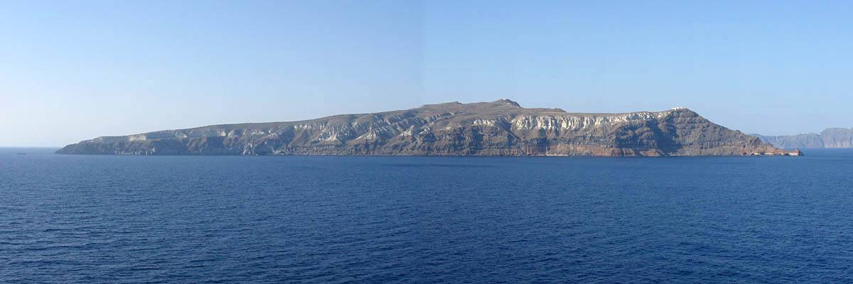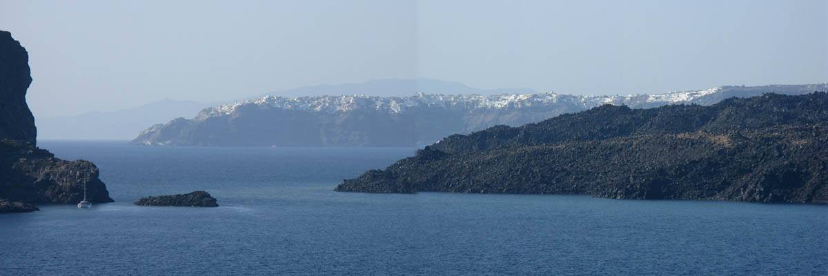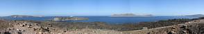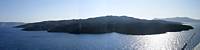 Wow! Even early in the morning this panorama shows Santorini in all it's glory. 180 degrees East through South to West. | Looking across to Thirassia catching the early morning rays. |