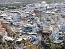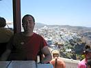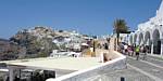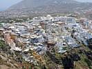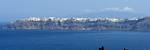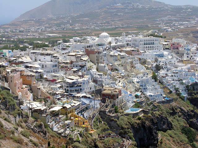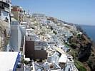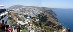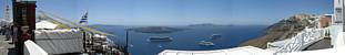 Looking South across Fira from a restaurant above the cable car. | A table with a view! | Panorama from a higher lookout point to the North of the cable car station. Beyond Fira is farm land. The highest mountain in the background is Mesa Vouno (369m). | Closer views Southwestwards across Fira from the lookout point. The second image allows a clearer view of the land beyond towards Mesa Vouno. |