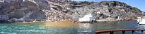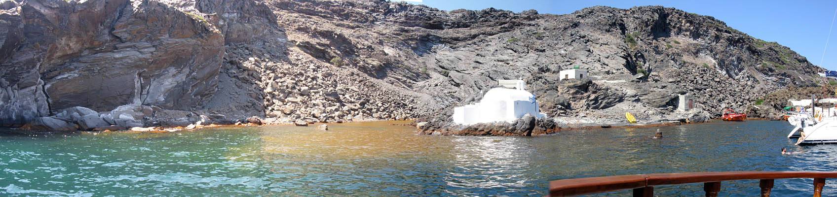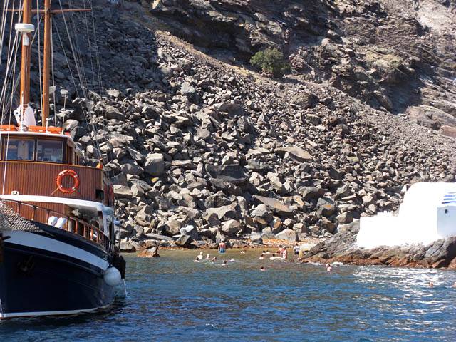 As we waited on the jeti at Erinia cove to board the boat I could see a school of fish underneath, using the boats as cover. Soon we were on board and heading across to Palea Kameni where the Hot Springs were in a small bay. By the time we arrived we had both stripped down to the swim wear that we put on before breakfast. Renée wasn't sure she wanted to do the swim but we could see it wasn't that far and the current wasn't too strong in this sheltered area. After a little hesitation I had fun jumping off the boat into the sea. Behind me Renée hesitated before being persuaded to go for it by people behind her who wanted to go too. Once in the sea and floating safely she loved it! We both swam without problem side by side, using breast stroke. It was a little cool but not too cold. Soon we reached shallow water and we could touch the bottom. The water warmed up in pulses as we waded into the area of the springs. It was luke warm with lots of brown sediment and a few floating pumice stones. After reaching the far end we headed back out. I picked up a floating pumice stone on the way out. The boat had moved closer so it wasn't far at all to reach the ladder to climb back onto the boat. Then we dried off and put our clothes back on. We also bought some cookies. We both had salty mouths and I was hungry after that swim and hike. I took some more pictures of the hot springs area before we departed.