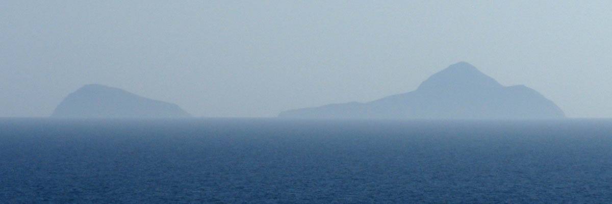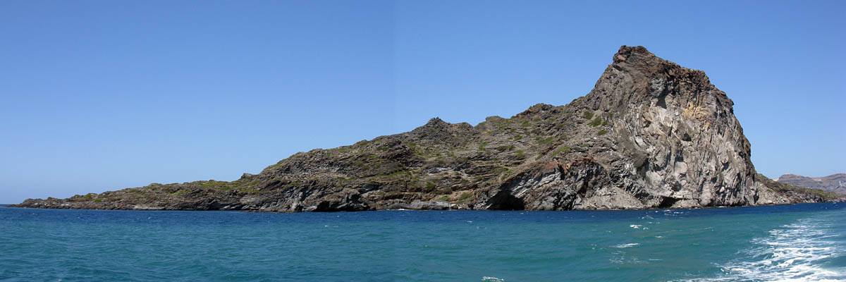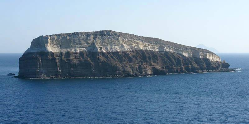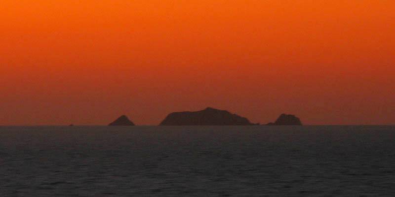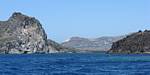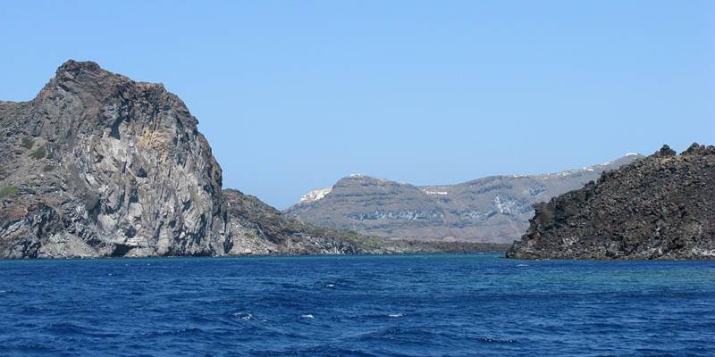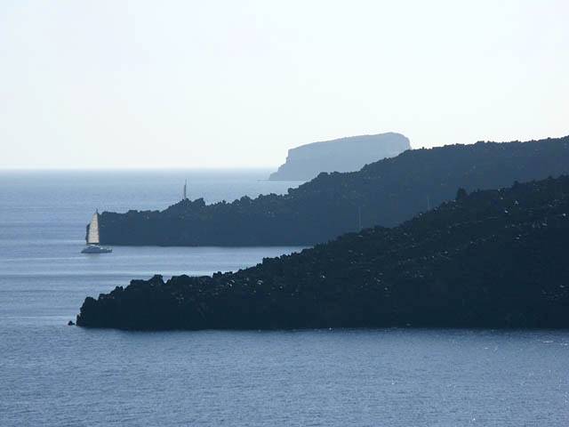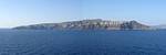 The Southern end of Thera. | Mesa Mouvos to the East. This mountain is made of limestone, compared to volcanic rock for the rest of Santorini. | Aspronisi. | Christiani and Askania, a couple of small islands Southwest of Santorini. | Heading past the Southern side of Thirassia and out of the Santorini Archipelago. |