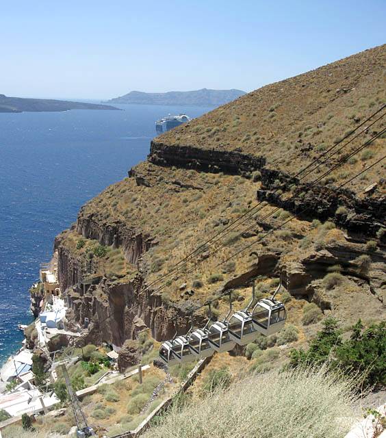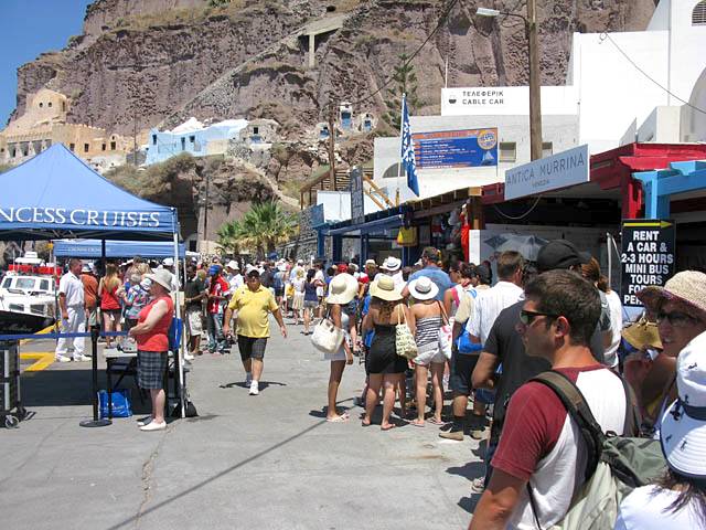 A long sweaty cable car queue. | Our cable cars arriving. | The donkey track from the cable car. | Up top the view is breathtaking. | The Equinox and Crown Princess looking a bit smaller now out in the caldera with Nea Kameni behind them. |