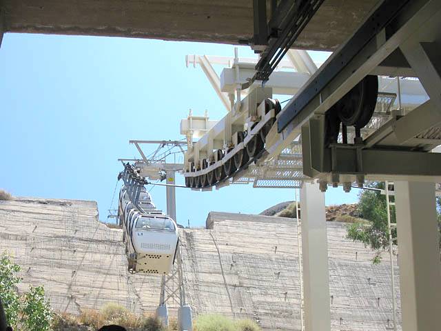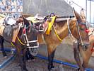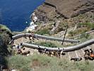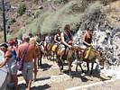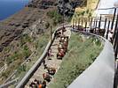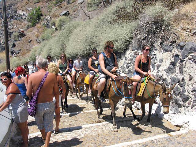 The buildings built into the cliff side at the Northern end of the port. | American tourists enjoying a donkey ride up from the port. | Renée on the donkey track. | A passing cable car. | The Equinox beckons. We are both weary and in need of showers now. |