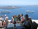 At the bottom we got straight onto a shuttle boat without waiting and were straight off back to the ship. It was another rocky ride back but no worse than this morning's rides. We were back aboard some time before 3PM. We made a beeline for the room. I took migraine pills and we both peeled off our clothes and swim wear underneath, and showered off the salt, sweat and donkey poo! That was refreshing! At 3:45PM I headed to Oceanview to eat while Renée did her hair. Renée joined me there at 4PM. We enjoyed view of Thera while eating. The bad restaurant meal was long forgotten now and the migraine clearing too. We got chatting to other people who shared our table. At about 4:30PM we went up to the Lawn Club and then walked across to Deck 15 Fwd. This gave me a chance to take another 360 degree panorama now the sun was more favourable for Thera.