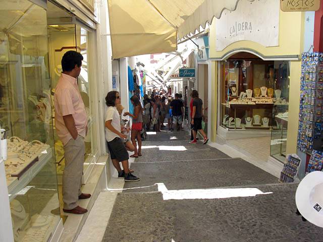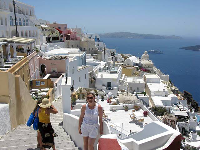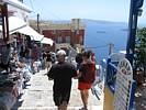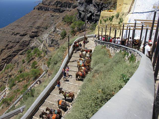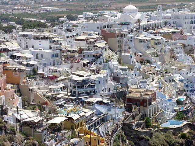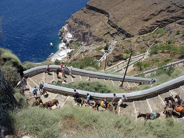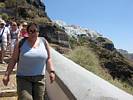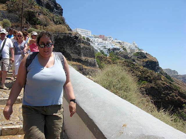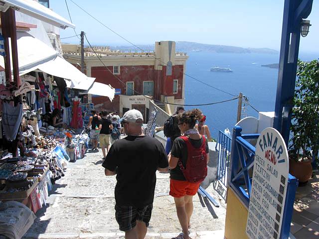 After the restaurant we walked around Fira. We noted that the cable car queue at the top was even longer! I bought a fridge magnet from a souvenir shop. After walking as far as the big church and admiring the stunning view, we decided to skip that long cable car queue and walk down the donkey track. That was a nice picturesque and steep route down, albeit rather smelly and a lot of donkey poo blowing around in the breeze.