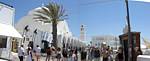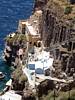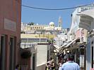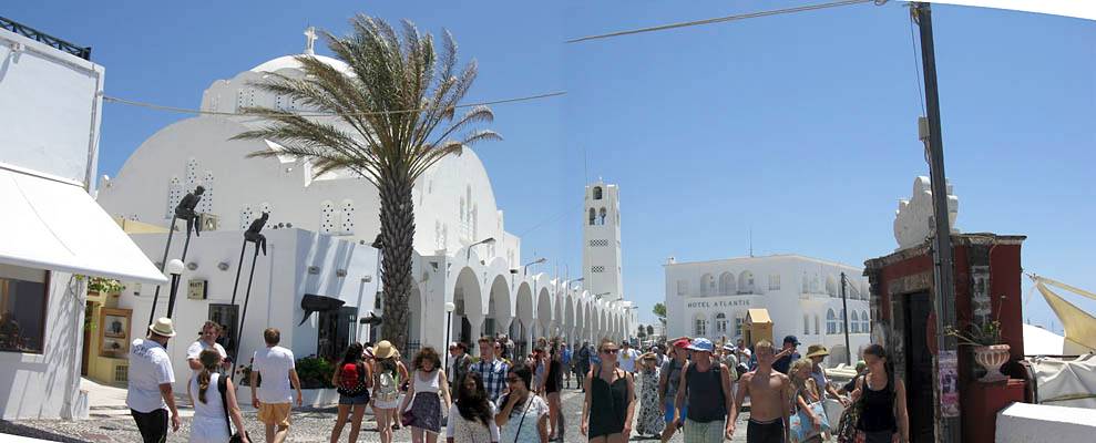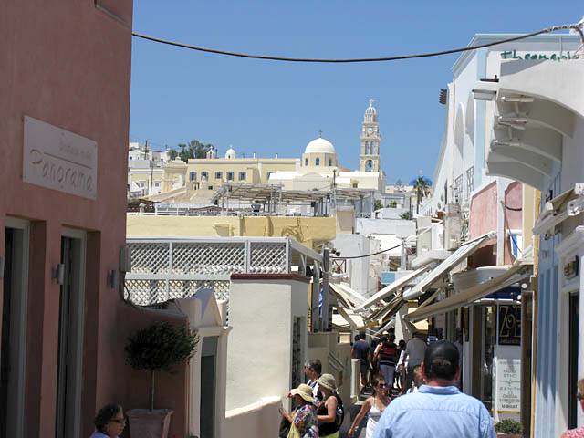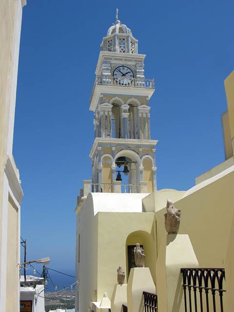 Looking 900 feet down to the port. | A clock tower. | Walking along the alleyways of Fira. | Looking Northeast. Nea Kameni is to the left. Thirassia in the background. | Near the Southern end of Fira is a large church. |