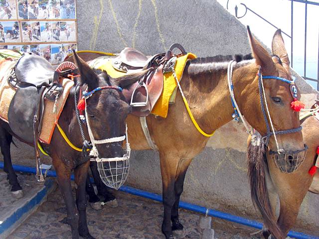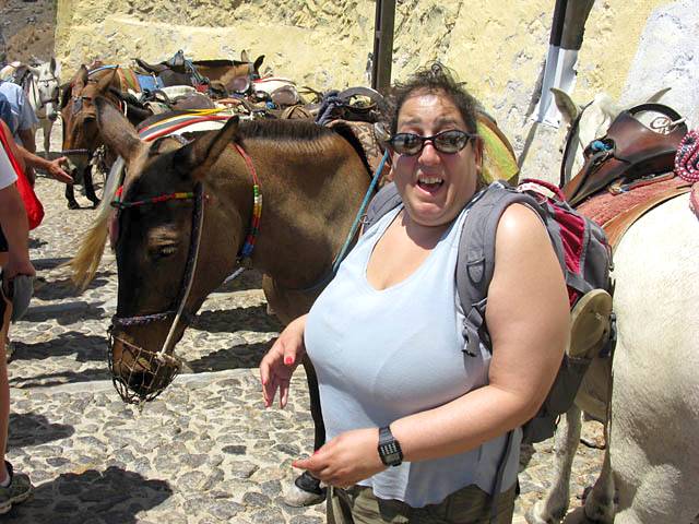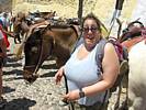 Another view of the South end of Fira. | The top end of the donkey track. | Donkeys! | The donkey track winding away below us. | Renée got tailswiped just as I took a picture of her with the donkeys, hence the surprised expression. |